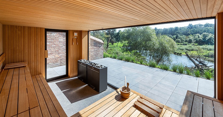 Deze verandering in architectuur vraagt uiteraard ook om technische aanpassingen. “Glas in sauna’s moet niet alleen hittebestendig zijn, maar ook veilig. Daarom is het belangrijk om te kiezen voor panoramische ramen uit gehard glas en aluminium of houten deurkozijnen die bestand zijn tegen grote temperatuurschommelingen. Pvcdeurkozijnen zijn af te raden, omdat ze de warmte niet aankunnen.” “Waar vroeger enkel glas standaard was, maken we nu gebruik van dubbel of zelfs driedubbel glas”, gaat m. Heeren verder. “Dat biedt een betere isolatie en helpt om energiekosten te drukken. Daarnaast is de veiligheid en functionaliteit van sauna’s sterk verbeterd. Dankzij zelfsluitende scharnieren blijft de warmte binnen. Als de d eur van e en s auna o nbewust o p een kier blijft staan, kan dit veel energie verspillen. Dankzij deze innovatie is dat probleem opgelost.” Een andere slimme ontwikkeling is het deurdetectiesysteem. Wanneer de deur langer dan een minuut open blijft, schakelt het systeem de oven automatisch uit. “Zo wordt onnodig energieverbruik vermeden en kan je met een gerust hart ontspannen.”