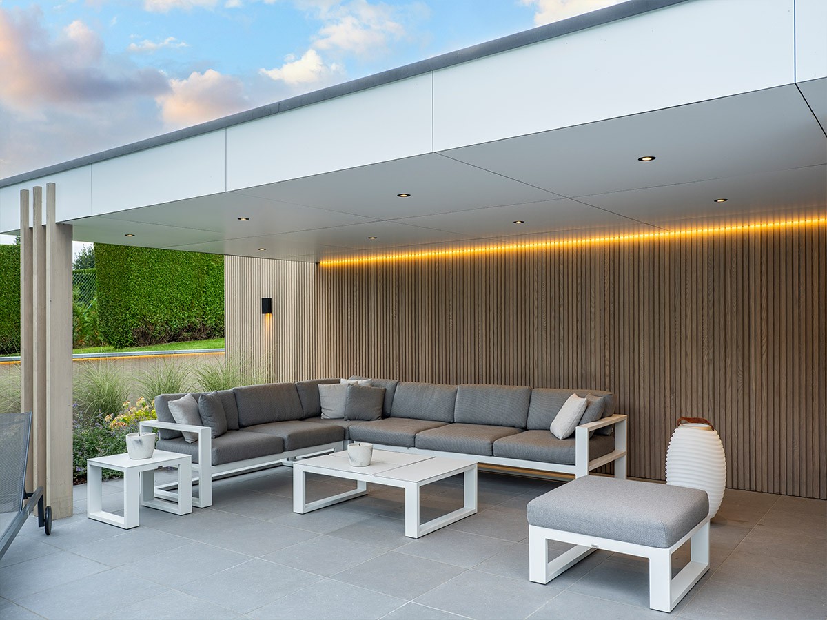 In ’s-Gravenbrakel bouwde Van Eeckhoudt Pools een strak, architecturaal poolhouse dat perfect aansluit bij het inox zwembad. Het ontwerp combineert een ruime loungezone met een afgesloten gedeelte voor techniek, sanitair en opslag. De gevels in thermo-essenhout, voorvergrijsd met waxolie, contrasteren subtiel met de witte Trespa-panelen van het plafond en de luifel. De ledverlichting en de buitendouche met warm water zorgen voor een luxueuze finishing touch.