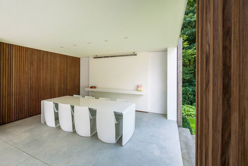 Dit modern bijgebouw sluit naadloos aan bij de woning en fungeert als poolhouse en overdekte zitruimte. Het behuist ook de technische installatie van het zwembad, die door het niveauverschil in de tuin onderaan in het bijgebouw is weg gestoken. De houten scheidingswand en de terassen in polibeton zorgen voor de verbinding tussen bijgebouw en woning. Achter de wanden en deuren in Corian zit er ook een toilet en een kleedruimte. De open haard in het gebouw zorgt ervoor dat het ook op koelere momenten heerlijk vertoeven is.