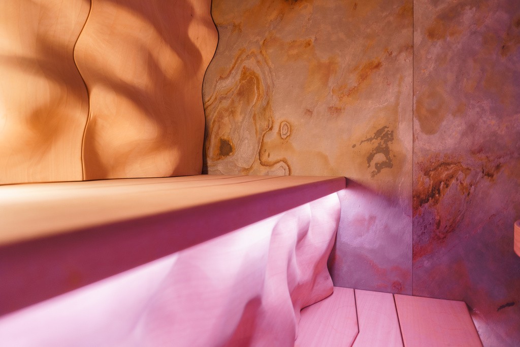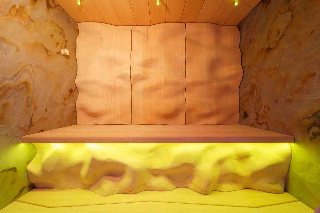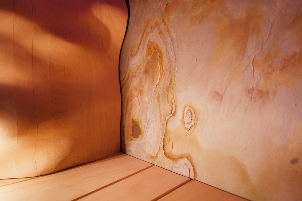 De achterwand en de verticale wanden van de banken domineren de set met hun dramatische 3D-vormgeving. De glooiende banken (type Wave) sluiten hier perfect op aan. Aan de zijkant word je omgeven door gemarmerd steenfineer. Tezamen met het 3D-hout ben je omringd als in een geborgen grot. De eivormige saunaoven Hive past met zijn zichtbare stenen perfect in dit decor. Met een beetje fantasie brengt Alpha Wellness Sensations de meest gedurfde wellness-ontwerpen tot leven.