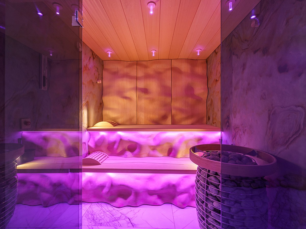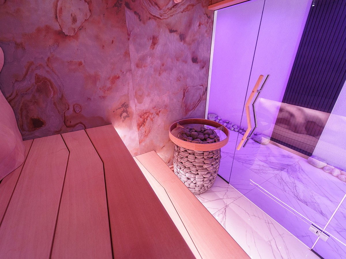 Deze privésauna, die ook voor verhuur wordt gebruikt, werd ontworpen als een echt pronkstuk van design en vakmanschap. De binnenafwerking combineert 3D-gevormd cederhout met wanden in steenfineer, speciaal ontwikkeld voor gebruik in de sauna. De glazen voorwand met inox handgreep en de krachtige HUUM HIVE-oven van 15 kW met 250 kg stenen maken lange opgietsessies mogelijk. De subtiele RGB-ledverlichting benadrukt de golvende lijnen en creëert een sfeervolle, moderne wellnesservaring. Een sauna die pure esthetiek en functionaliteit verenigt.
