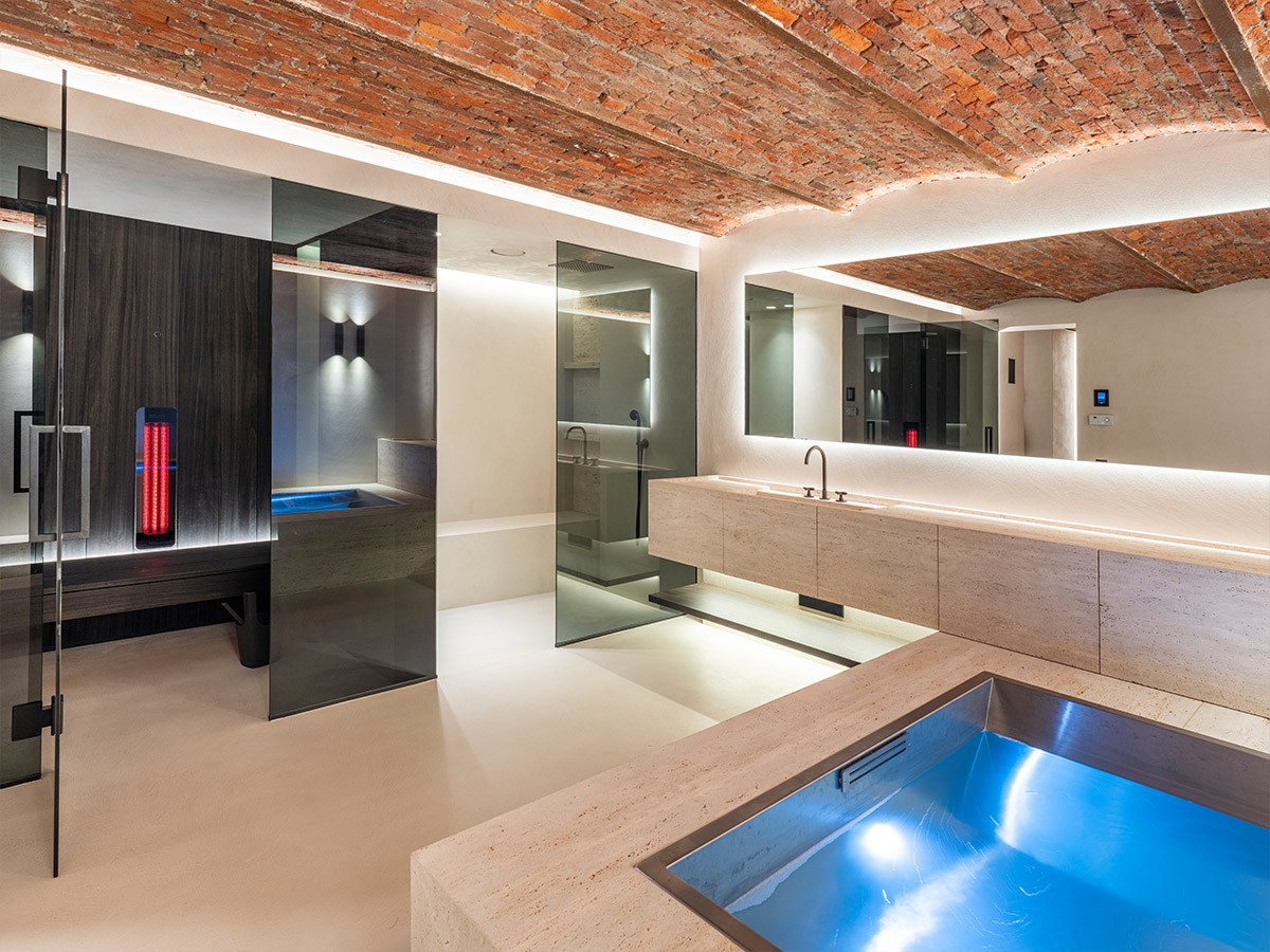 In een volledig gerenoveerde kelderruimte realiseerde de firma Sanigo Wellness uit Geel een op maat gemaakte sauna met geïntegreerde infraroodstralers. De afwerking in BlackWash Ayous en Mortex zorgt voor een krachtige, hedendaagse uitstraling. De zwevende bankopstelling achter een getinte glazen wand en de doorlopende zitbank naar de aanpalende douche versterken het gevoel van ruimte en luxe. Dankzij de perfecte detaillering en strakke lijnen vloeien binnen- en buitenafwerking naadloos in elkaar over – een toonbeeld van stijlvol maatwerk en verfijnde eenvoud.