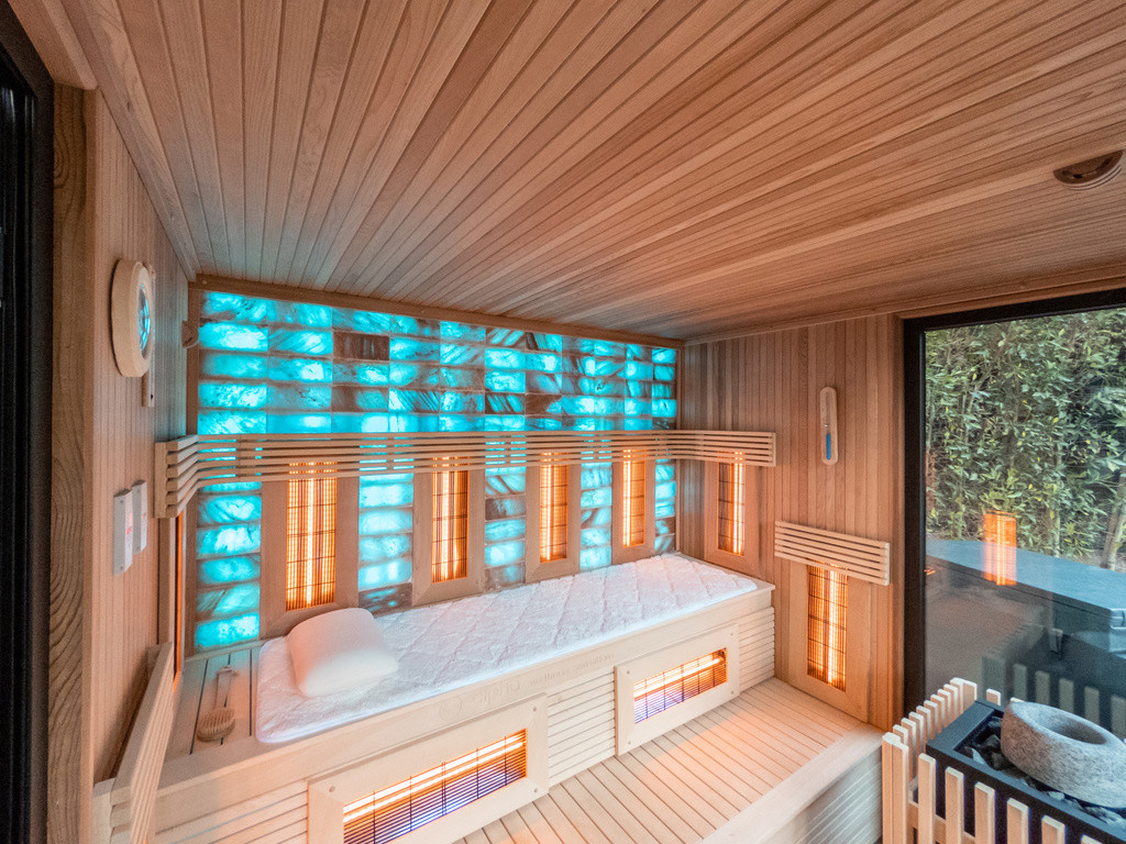 Ook binnenin de sauna is het luxe troef. Het mooie ayoushout geeft die typische warme en gezellige sfeer van een Finse sauna. Ook de saunaoven is er mooi mee afgewerkt. Verder zijn er 10 full spectrum infraroodstralers die gecombineerd met de sauna of afzonderlijk gebruikt kunnen worden. De banken en de stralers zijn zo opgebouwd dat het gehele lichaam kan profiteren van de kracht van de infrarood. Als kers op de taart is de volledige achterwand bezet met zoutstenen uit de Himalaya die een sfeervolle gloed geven dankzij de indirecte verlichting erachter. Een knap staaltje maatwerk!