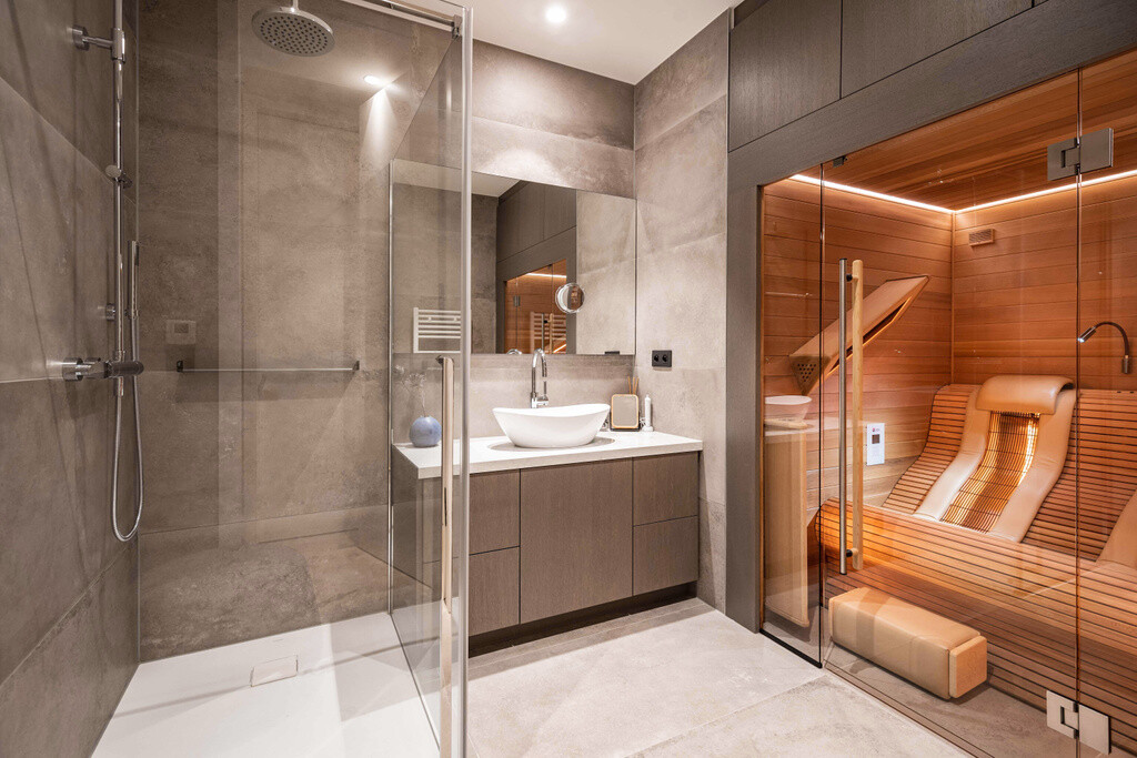 In deze badkamer werd langs de lavabo aan één kant ruimte voorzien voor een mooie douche, aan de andere kant voor een dubbele infraroodcabine. Ondanks de beperkte oppervlakte heb je er een ruim en open gevoel door het slim gebruik van glas als wanden. De ergonomische zitbank biedt plaats aan twee full spectrum infraroodstralers die afgewerkt zijn met leder zodat je heerlijk zacht en comfortabel zit. Er zijn hoofdsteunen voorzien, een voetensteun en een leeslampje. Dus alle faciliteiten om hier lang te genieten. Ook van de zijkanten en de voorkant wordt er warmte toegevoegd via de extra stralers. Het geheel wordt verder sfeervol verlicht met ledstrips rondom het plafond. De gemakkelijke bediening via het Alpha Adaptive Smart Control-systeem laat je toe de straling en de warmte volledig af te stellen naar jouw individuele voorkeur. Laat die Belgische regenachtige dagen maar komen, hier is het heerlijk vertoeven en ontspannen!