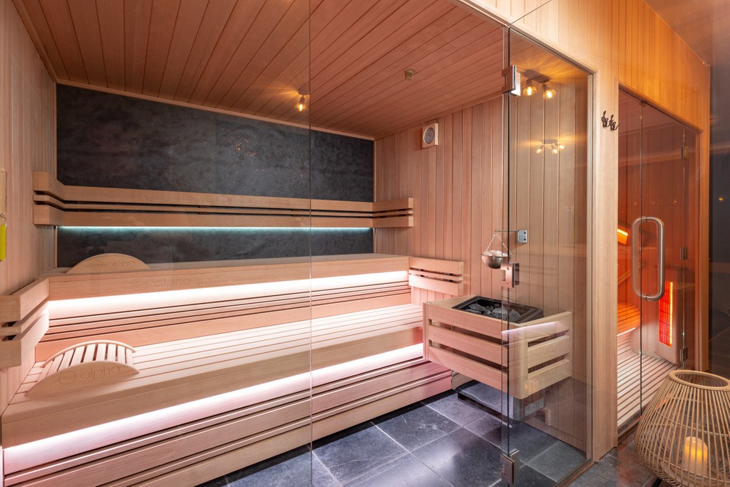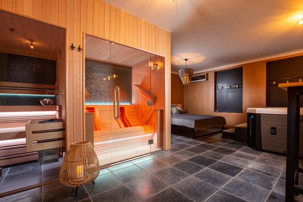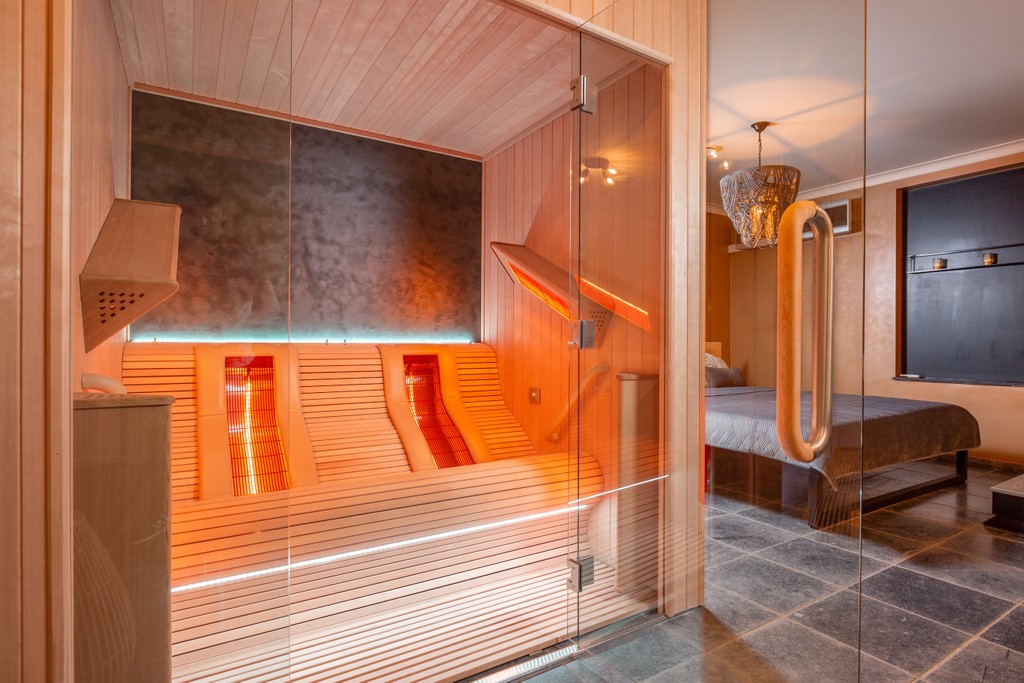 In de wellness werden een sauna en lounge-infraroodcabine van het type Chaleur geïnstalleerd. Beide met een glazen voorwand zodat alles één voelt in de ruimte.De binnen- en buitenafwerking werd gelijklopend bekleed met hemlock planchetten. De achterwand van beide werd afgewerkt in steenfineer. De infraroodcabine voor 2 personen heeft 6 full spectrum stralers gepositioneerd volgens de ergonomische bank. In de sauna kan men zich op 2 niveaus installeren met aan elke zijde een rugleuning. De ledverlichting kan elke kleurschakering oproepen en boven de saunaoven kan via de wandbevestiging een schaaltje gehangen worden om zout of etherische oliën te verdampen. Zo wordt de ontspanning een volledige belevi