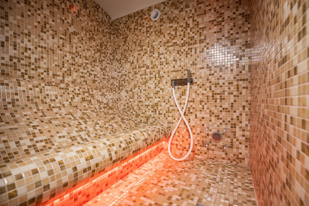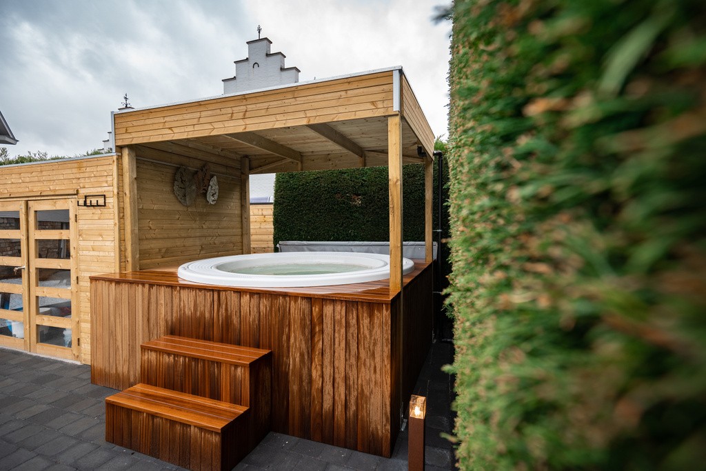 Aan de andere kant van de ruimte bevindt zich de stoomcabine. Deze is bekleed met mozaïek in een zachte bruin-beige schakering. De bank is ergonomisch afgerond wat mooi uitgelicht wordt door de RGB-ledstrip net onder de neus van de bank. Afkoelslang, verse luchtinvoer en aromapomp geven je een complete stoombad-ervaring. Last but not least vinden we buiten de ronde spa. Deze is gezellig ingewerkt in een houten overkapping naast de haag en laat je uitkijken over het grote zwembad. Massagejets en luchtpomp zorgen voor het nodige bubbel- en bruiseffect. De overloop van de spa komt uit in de buffertank van het zwembad, dus ook ecologisch werd alles op punt gesteld. Gerust genieten van al deze faciliteiten!