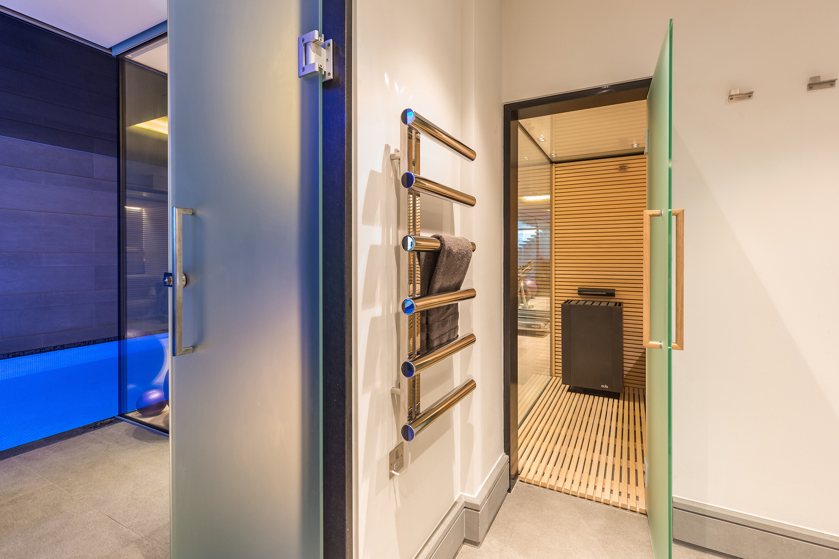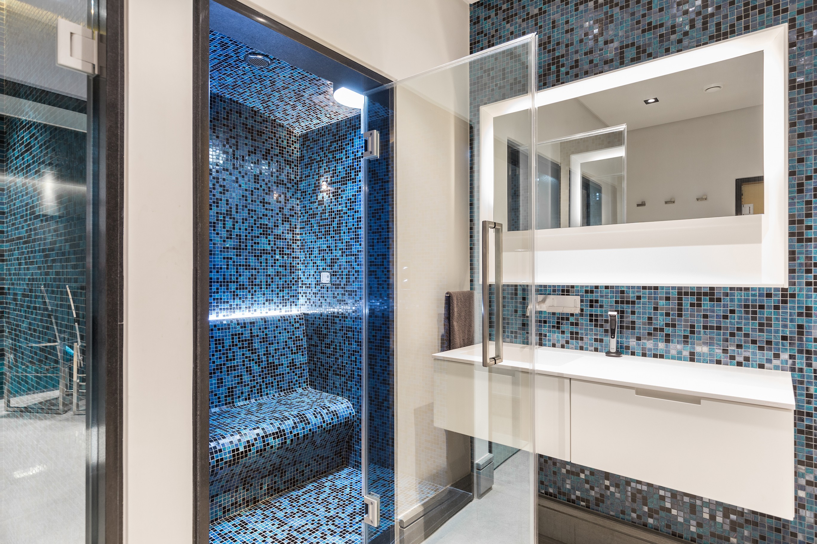 Een woning op de Bischops avenue in Londen spreekt altijd tot de verbeelding. Als deze dan nog door een architect verbouwd wordt, mag je je helemaal aan een droomplaatje verwachten. De ultramoderne ruimte baadt in een warme gloed. Spiegelende wanden, goed geplaatste verlichting en knap gebruik van kleuren creëren een stijlvol geheel. De mozaïekbetegeling van de hamam, in aquabauw met zwart geblokt, werd verder doorgetrokken naar de aansluitende muur met lavabo. Verder zien we deze betegeling ook terugkomen in de spa van het zwembad. De indirecte ledverlichting laat de kleurenpracht mooi uitkomen.