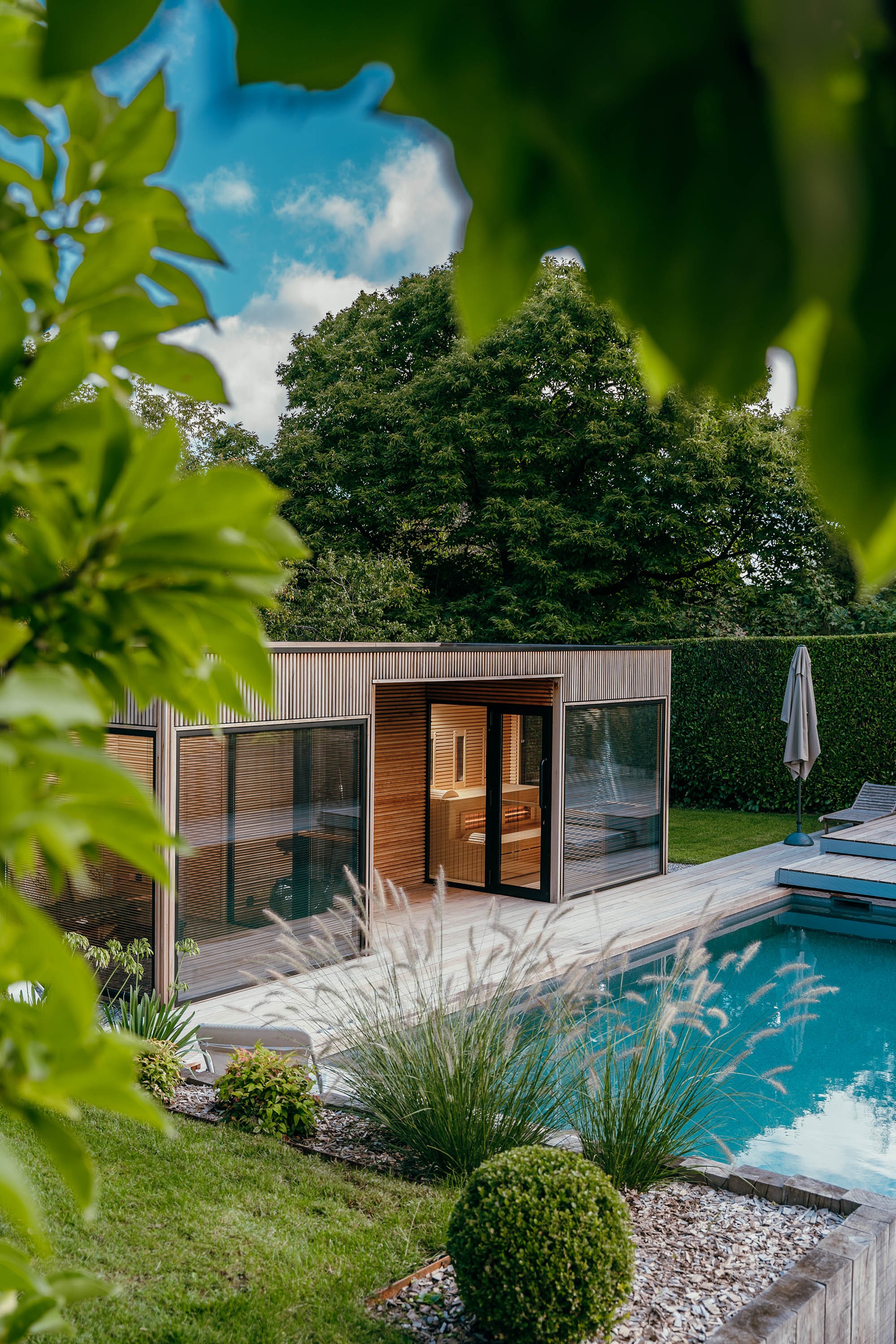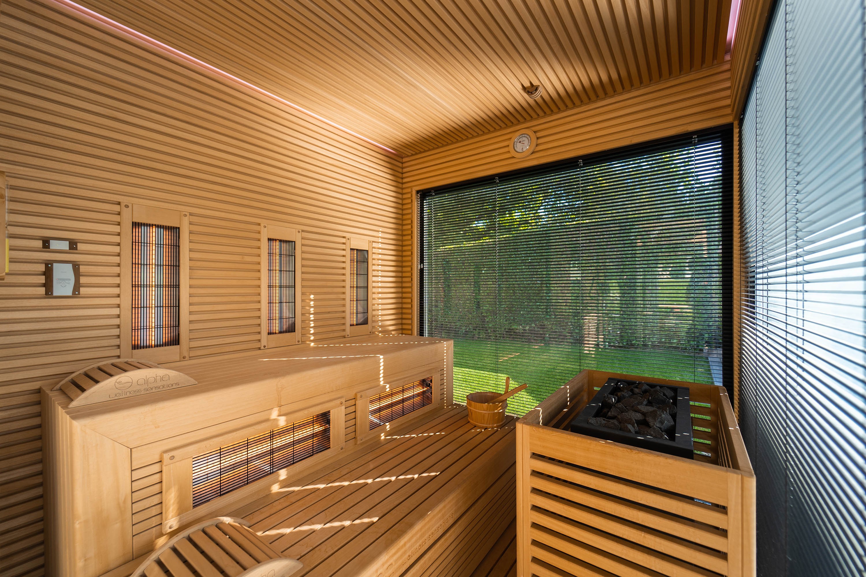 De sauna is van het type Chaleur met ingewerkte infraroodelementen om rug en benen te bereiken met diepe stralingswarmte. Er zijn banken op twee niveaus die ruim plaats bieden om met vier personen languit te liggen. De douche, het toilet en de omkleedruimte werden volledig bezet met mozaïektegeltjes. Deze ruimte wordt net zoals de open yoga-ruimte verwarmd via vloerverwarming. Een heerlijk luxueuze ervaring! Er werd overal gebruik gemaakt van energiezuinige ledverlichting en met de bluetooth-luidsprekers kan je overal de gewenste muziek afspelen. Een plaatje dat helemaal klopt in deze mooie tuin met zwembad.