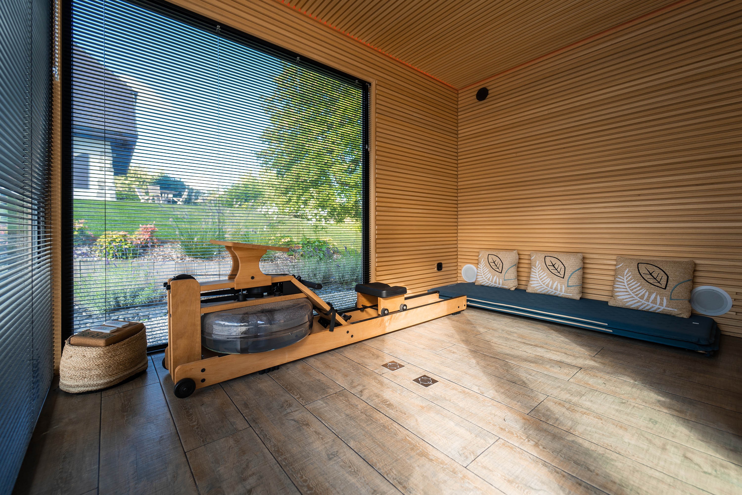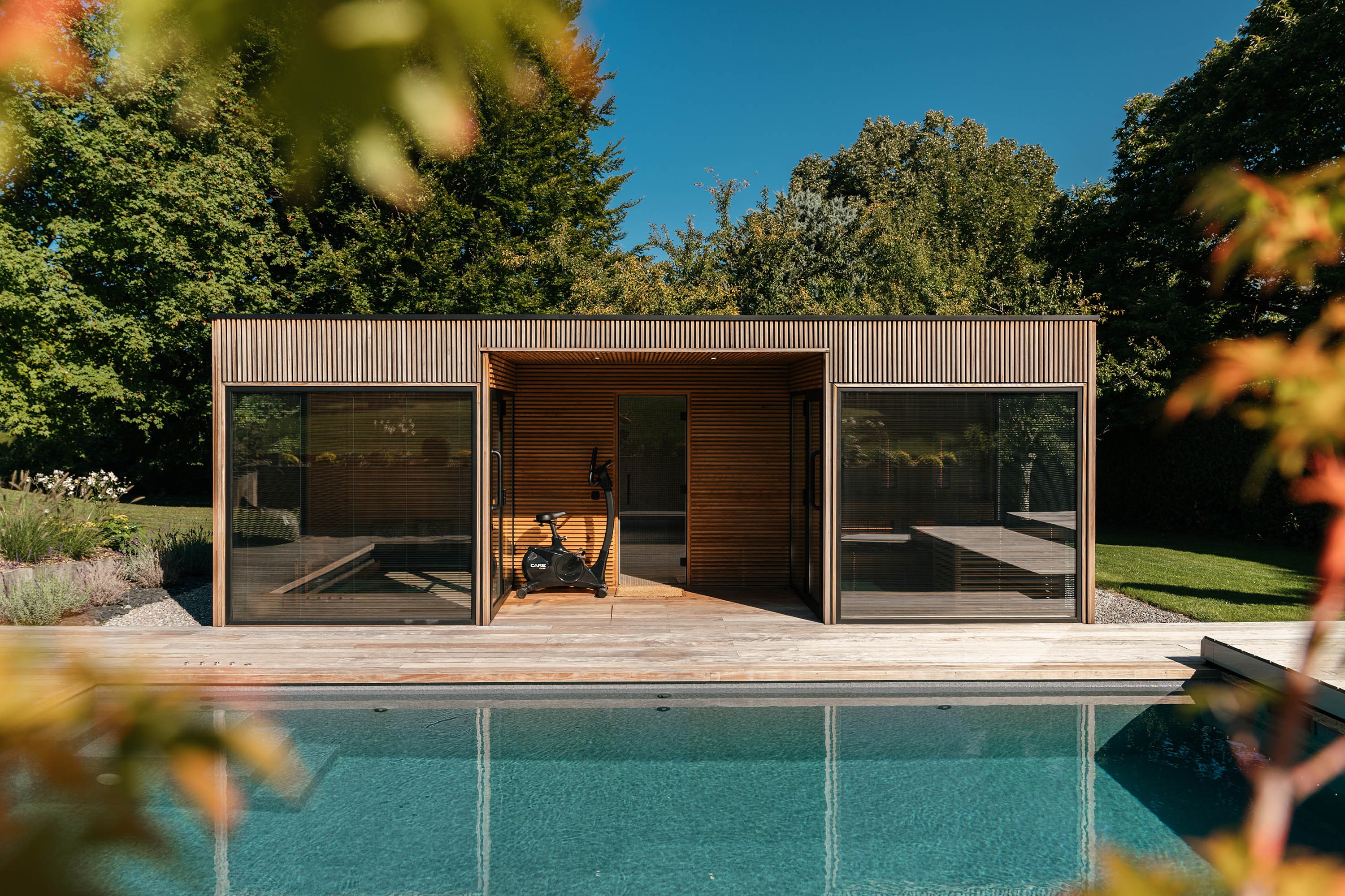 Aan het zwembad van deze woont te Neuvecelle wilde de klant graag een poolhouse met verschillende faciliteiten. Volledig op maat gemaakt, ontwierp Alpha Wellness Sensations een gebouw dat uit 3 units bestaat, allemaal in het teken van een heerlijke wellnessbeleving. Zo is er de yoga- en fitnessruimte die langs 3 zijden uitkijkt op het zwembad en de tuin. De ideale plek om aan je fysiek te werken of om helemaal zen te worden. Ook de sauna heeft een prachtig panorama-raam dat een breed uitzicht geeft op de tuin. Tussenin bevindt zich de sanitair- en doucheruimte die dan weer geniet van perfecte privacy.