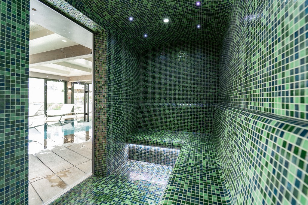 De Chaleur Pro hamam werd hier afgewerkt met een speciale mix van groene mozaïek. Hiermee werden zowel de bank, de wanden, het plafond als de vloer bezet. Het resultaat is echt futuristisch, maar met een warm en natuurlijk gevoel. Het is trouwens de warmte in combinatie met de vochtigheid, die zorgt voor de weldadige effecten van een stoombad. Het opent de poriën en zuivert de huid door onzuiverheden en bacteriën te verwijderen, het maakt de sinussen en neusgangen vrij voor een gemakkelijkere ademhaling en het biedt onmiddellijke verlichting bij spierpijn. De gekleurde spots en indirecte verlichting aan de bank zorgen voor een rustige sfeer. De brede glazen deur kijkt uit op het zwembad, dat op zijn beurt uitgeeft op een Engelse privé-binnenplaats, zodat je van een prachtig uitzicht op de koninklijke stad Loches kan genieten. Royaal ontspannen dus!