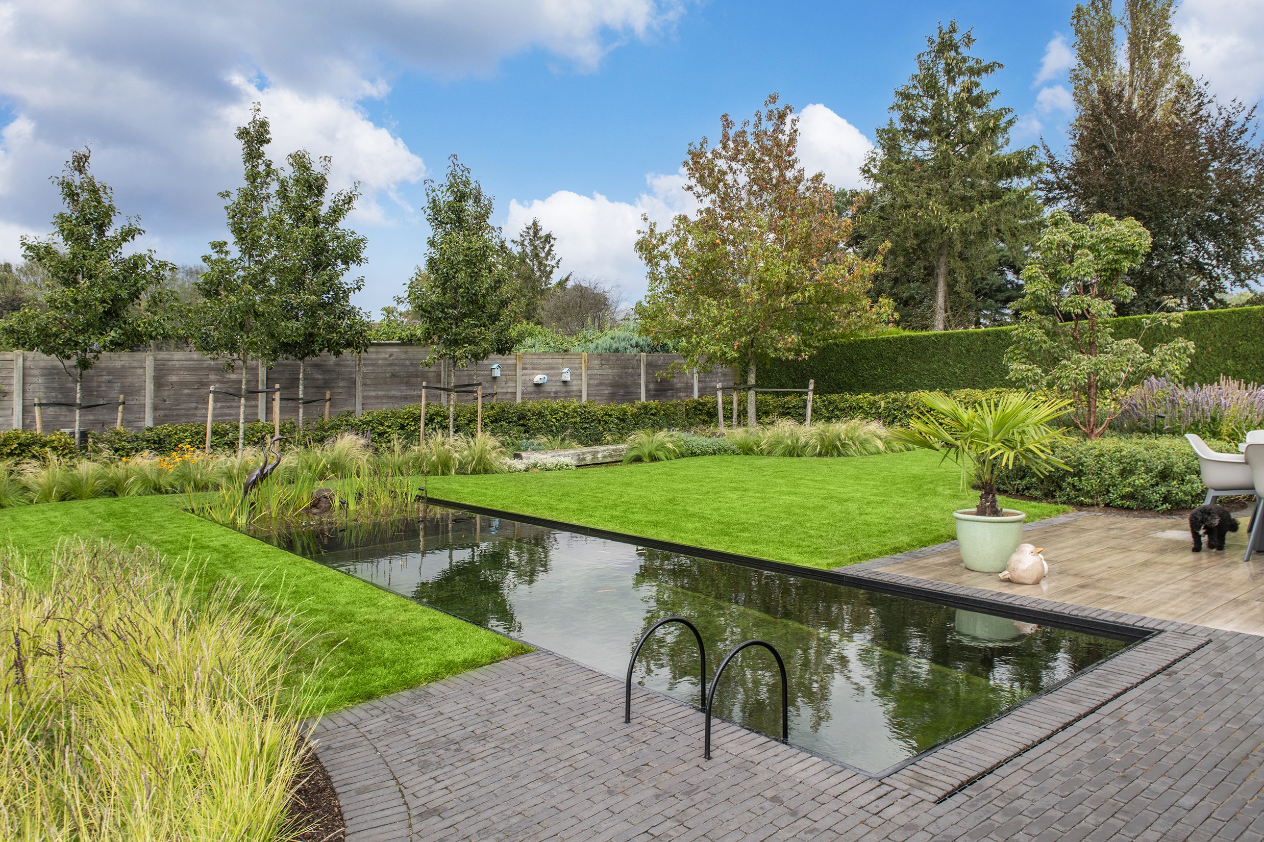 Het gezin dat hier woont, geniet dagelijks van de downlflowzwemvijver. Logisch, want het water is van zulke goede kwaliteit dat zelfs goudwindes er vrolijk in rondzwemmen. Het strakke, rechthoekige ontwerp is afgewerkt met een minimalistisch grasrandprofiel, waardoor het gazon perfect aansluit op het wateroppervlak. De op maat gemaakte trap is in dezelfde stijl uitgevoerd. Waar de zwemvijver aansluit op het terras, volgt de plaatsing van de kleiklinkers de contouren van de waterpartij. Twee bronzen reigers in de plantenzone maken het plaatje compleet. Kortom, dit project is een knap staaltje vakmanschap, iets wat we van de firma Cools Tuinaanleg gewend zijn.