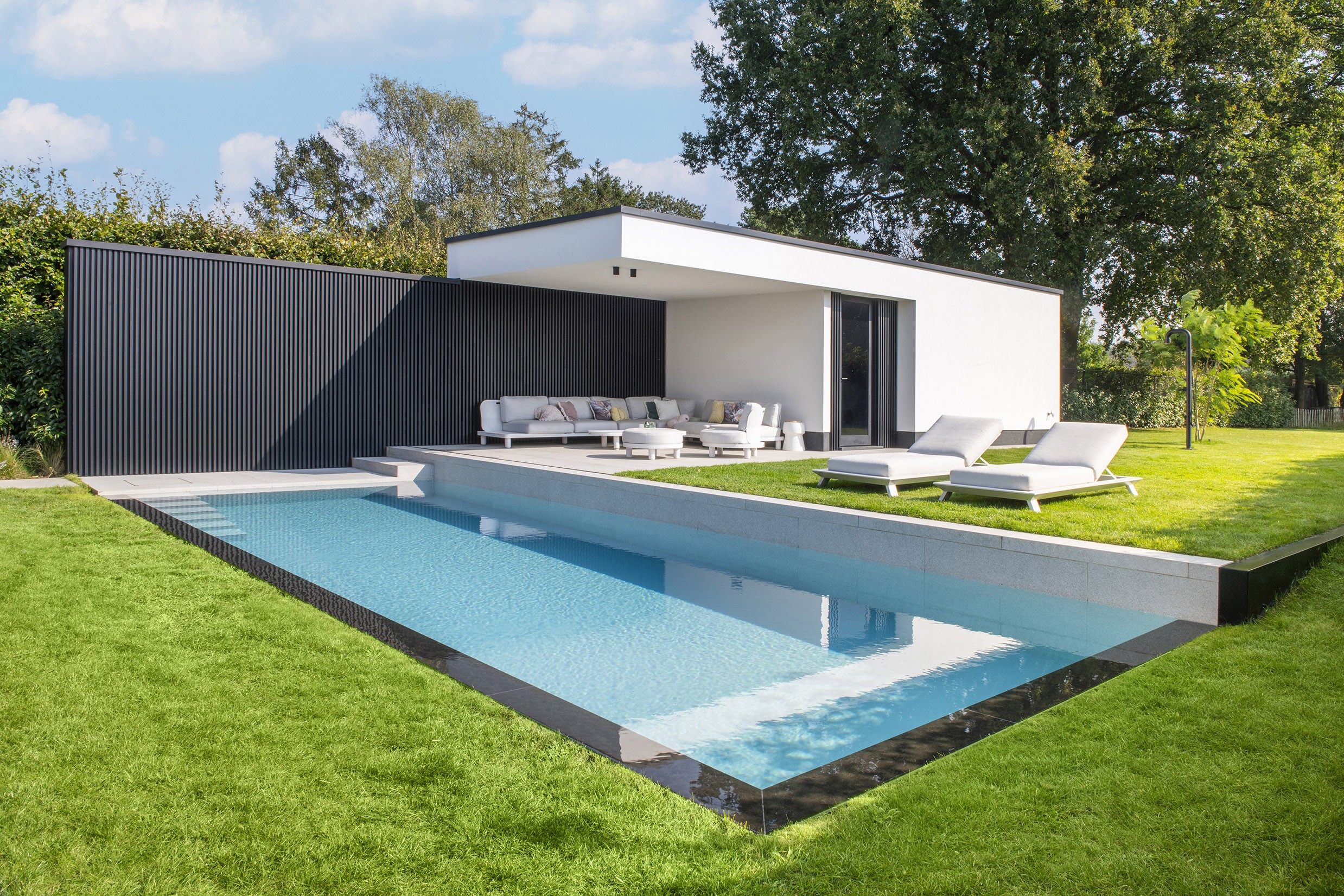 Een zwembad in de tuin betekent voor velen een dagelijkse dosis extra geluk. Ook bij dit project, uitgevoerd door Lamberts+Swinnen, zijn de eigenaars zeer gelukkig met het resultaat. Samen met het moderne poolhouse en de buitendouche vormt dit zwembad een moderne oase in de tuin. Het zwembad ligt ingebed in een hoogteverschil van het terrein. Om het verschil in hoogte extra in de kijker te zetten, heeft men ervoor gekozen om de keramische tegels vanop het terras te laten doorlopen tot de bodem van het bad. De helft van de boord bestaat uit een prachtig weerspiegelende overlooprand uit zwart graniet. Deze zwarte kleur zien we als accent terugkomen bij de afwerking van het poolhouse, waardoor dit plekje in de tuin een charmant geheel wordt.