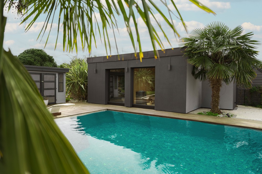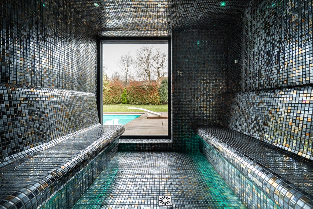 De eigenaar van deze woonst wenste een verbinding tussen het zwembad in de tuin en het wellnessgedeelte. Hiervoor zorgen 2 grote raampartijen in de zijwand van de sauna en het stoombad. In een aluminium omkadering sluiten deze zowel mooi aan bij het interieur als bij het donkergrijze exterieur van het poolhouse. Van het stoombad is de binnenkant is eveneens in sfeervol donker met een mozaïek in glanzend grijs en zwart met af en toe een gouden accent. Zowel de vloer, de banken, de wanden als het plafond zijn bezet met deze luxueuze steentjes. De juiste verlichting met spots en sterretjes in het plafond en indirecte, gekleurde ledstrips in de banken vervolledigen de kostbare sfeer.
