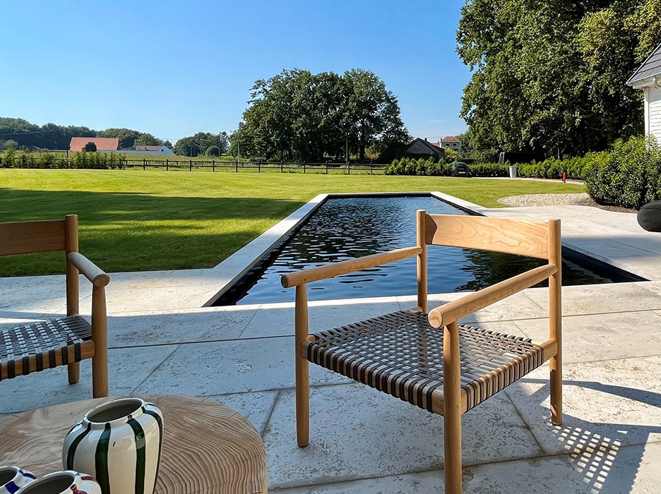 Het lijkt of dit zwembad er altijd al lag. Materiaalgebruik, terrassen, afmetingen en oriëntatie van het zwembad - alle elementen zijn in harmonie met deze villa en tuin in een landelijke omgeving aan de rand van Brussel. Missie geslaagd want dat was precies het opzet van HDB Pools. Op zonnige dagen is het water één grote lichtspiegel waarin wolken en bomen worden weerspiegeld.