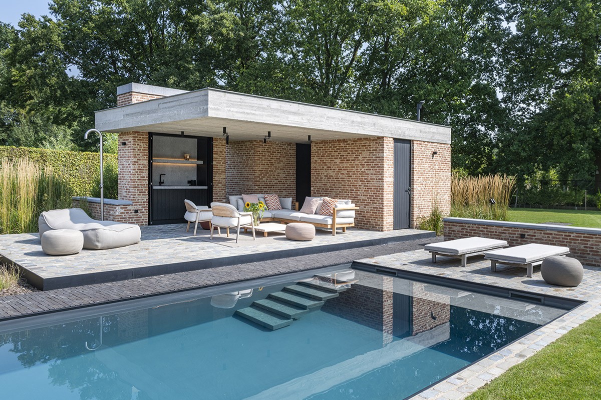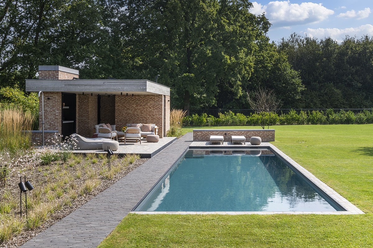 Zwembaden Valkenborgh verwezenlijkte tijdloosheid in deze tuin. Hun zwembad kwam in een sereen kader van Artecta-tuinen terecht en kreeg klassevol gezelschap van een poolhouse ontworpen door Bart America.