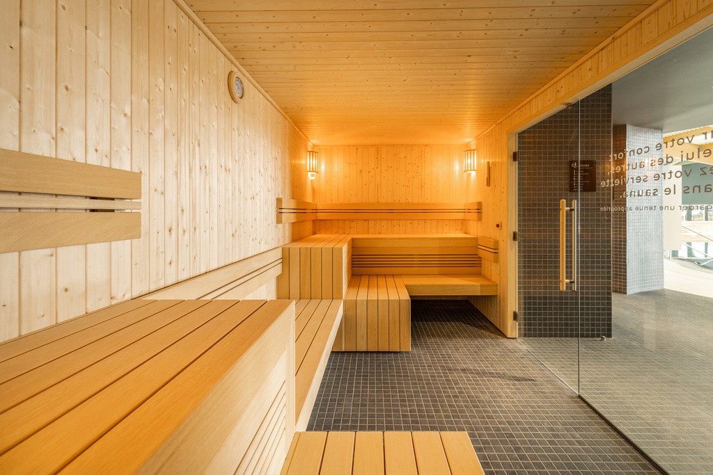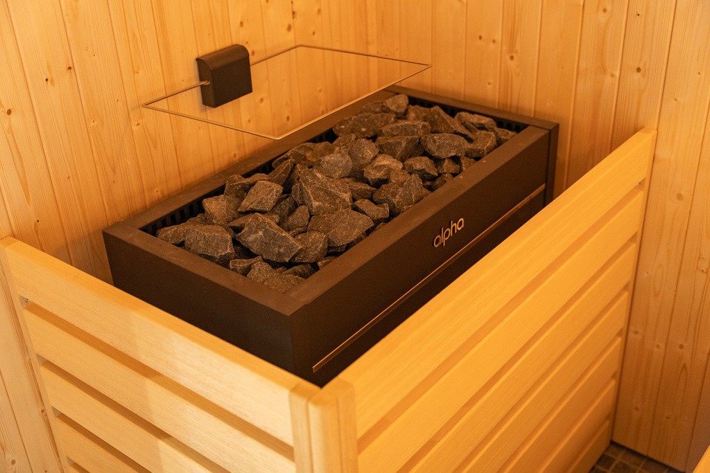 De Finse sauna van Alpha Wellness Sensations heeft een grote glazen voorwand om een open sfeer te creëren. De specifieke bankopstelling heeft een stuk dat opklapbaar is, zodat hier ook rolstoelgebruikers kunnen genieten van een deugddoende warmtesessie. De inrichting is uit vurenhout met traditionele saunalampen. Het stoombad ademt een Oosterse sfeer uit met de ronde vorm en rode mozaïektegels. Met de indirecte verlichting in de neus van de bank is het cosy gevoel compleet. Diezelfde verlichting maakt ook van de houten hottub in de hoek een pareltje. De halve cirkel in drie niveaus uit Canadese rode ceder is een luxueuze omkadering voor de spa die tien massagejets op je loslaat. Een beloning na het harde sporten!