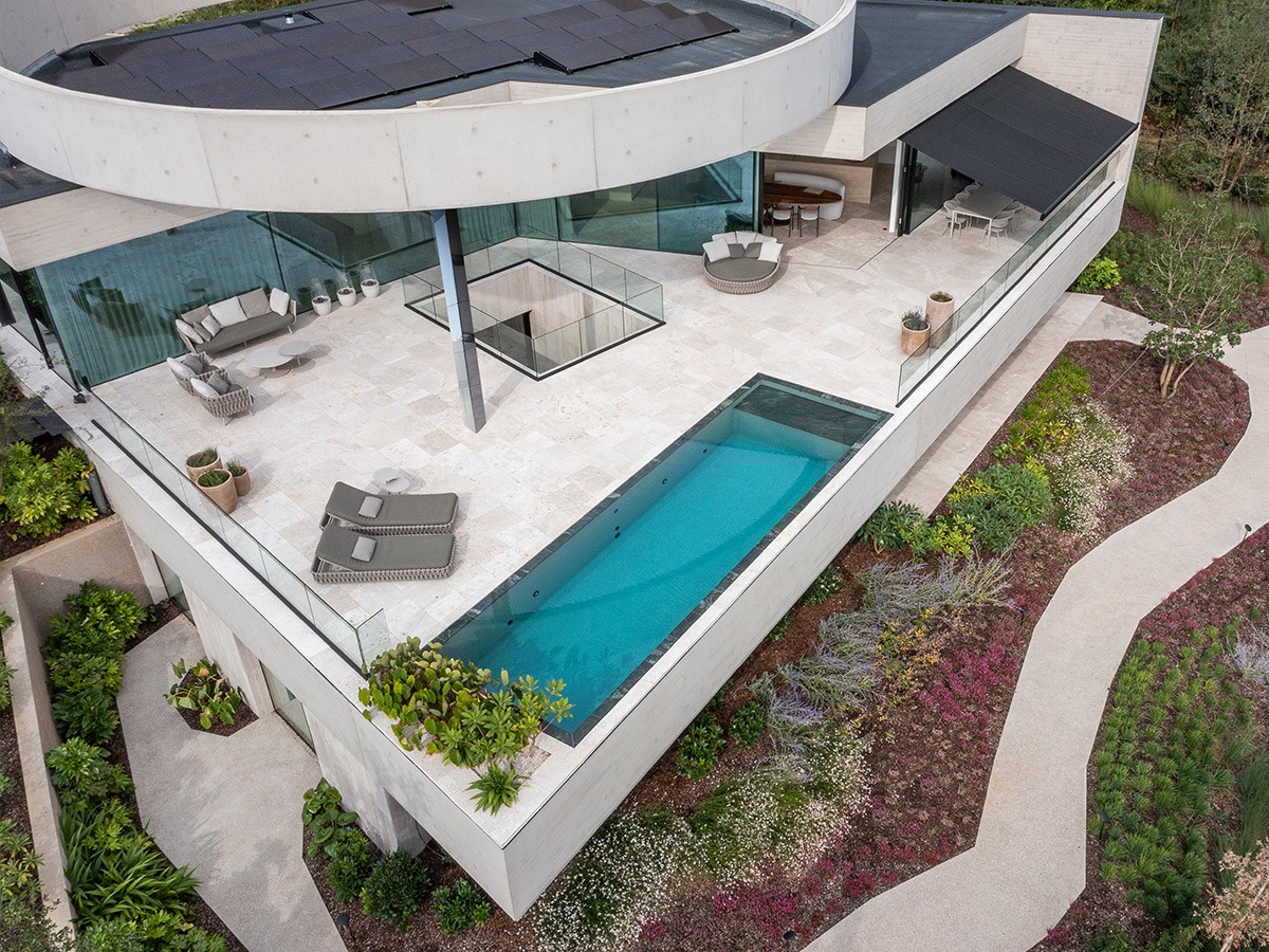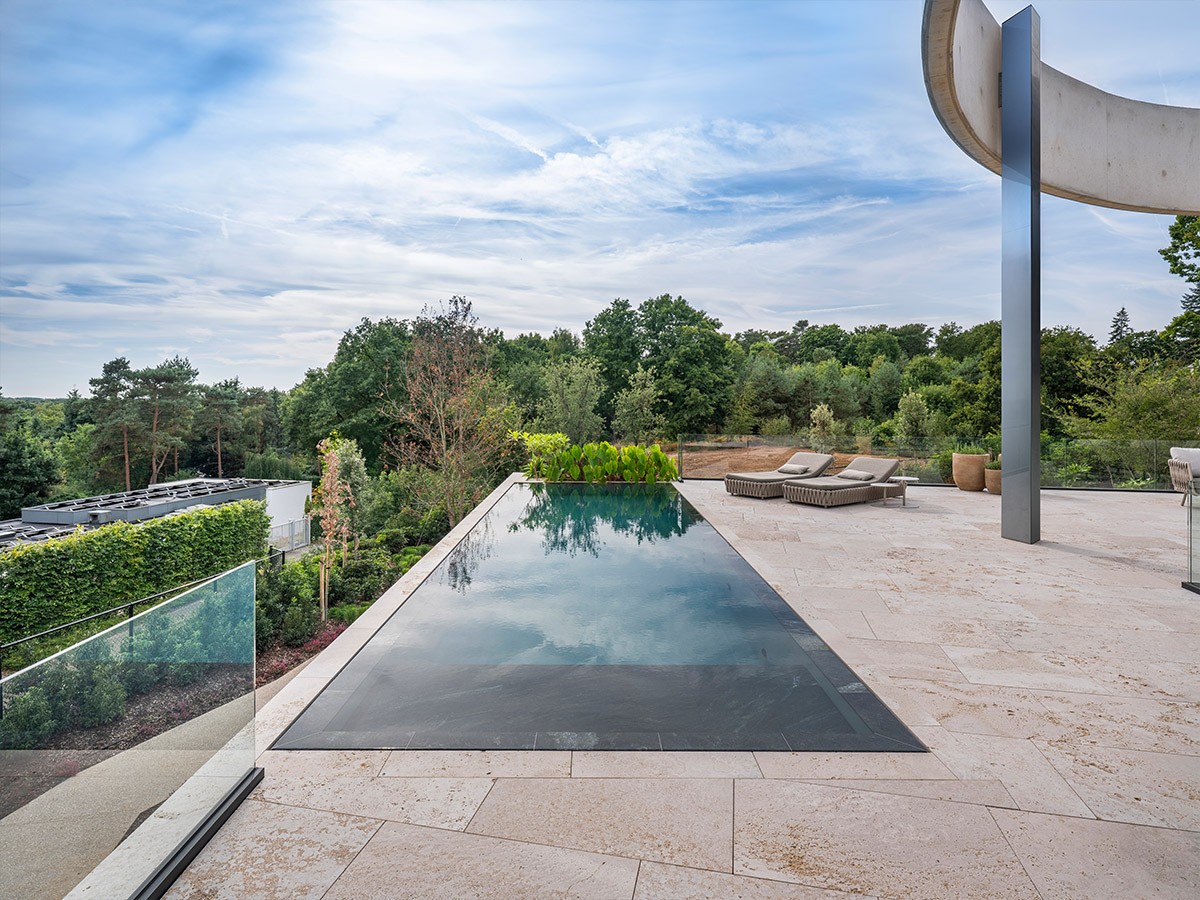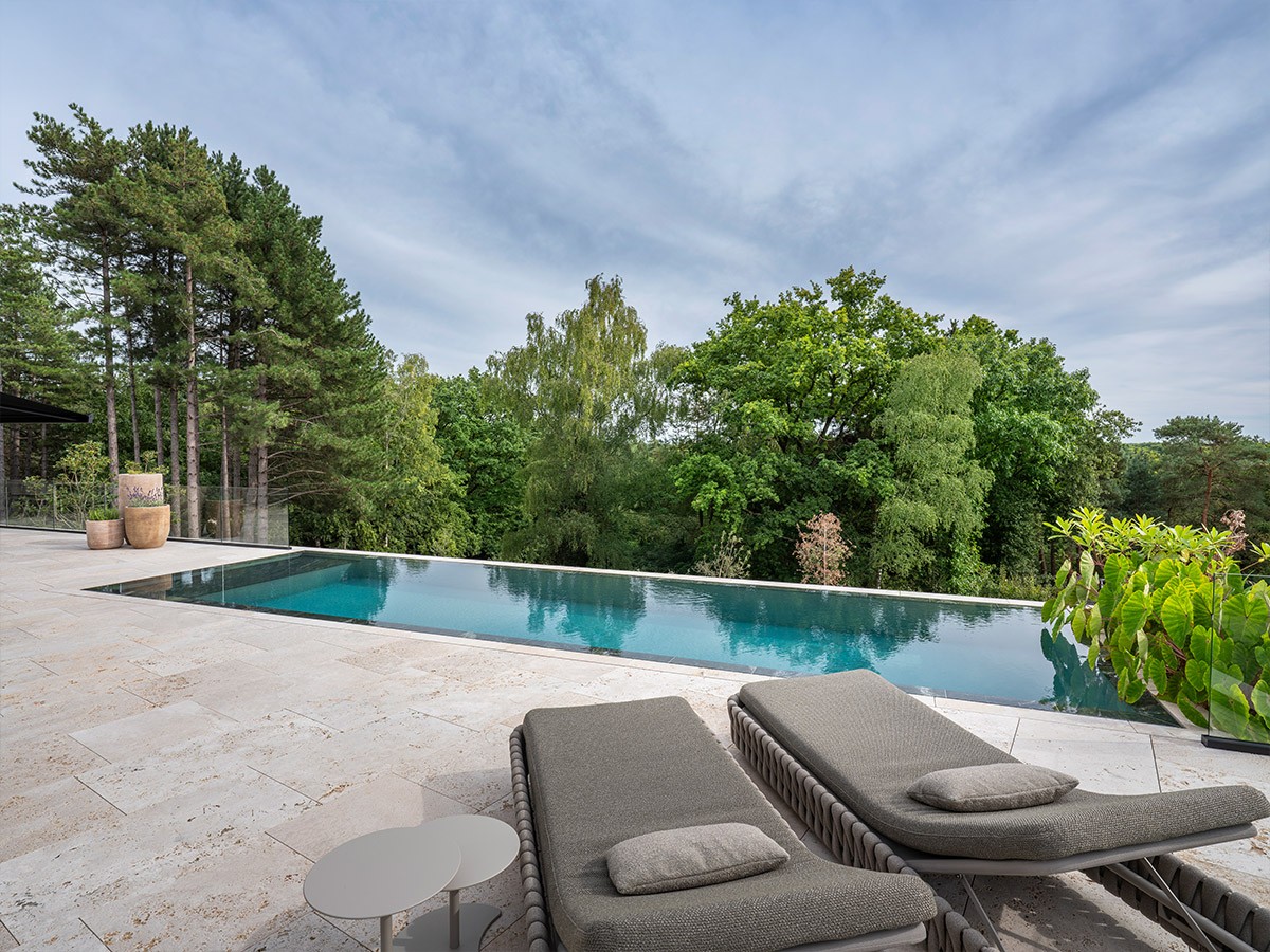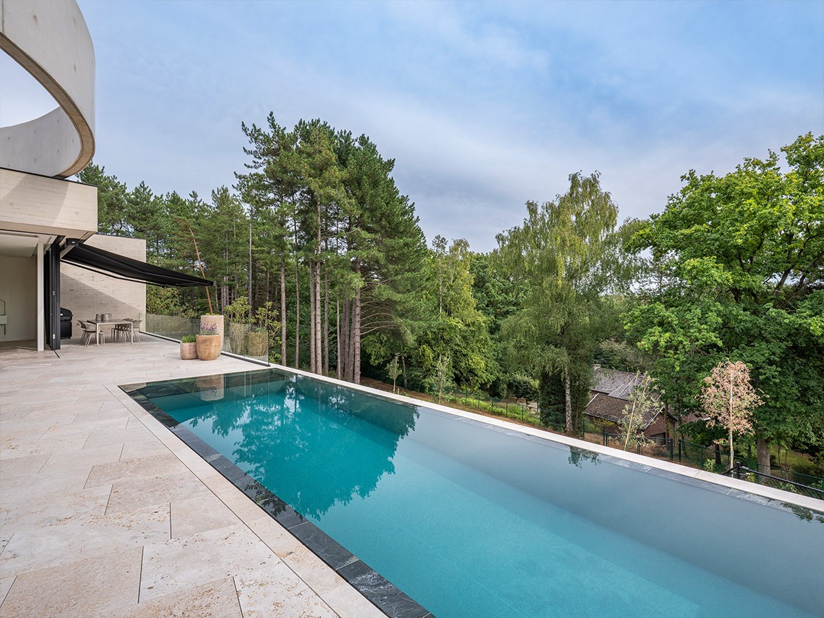 Een technisch en architecturaal hoogstandje: dit zwembad lijkt te zweven tegen de gevel van de woning in zichtbeton. De betonnen kuip is aan de woning verankerd en rust slechts op twee betonnen vinnen. De strakke afwerking in beplankt zichtbeton en de donkergroene Oostenrijkse kwartsiet zorgen voor een unieke, natuurlijke uitstraling die perfect aansluit bij de moderne architectuur. Een indrukwekkend staaltje vakmanschap en precisie, waarin techniek en design volledig samenvloeien.