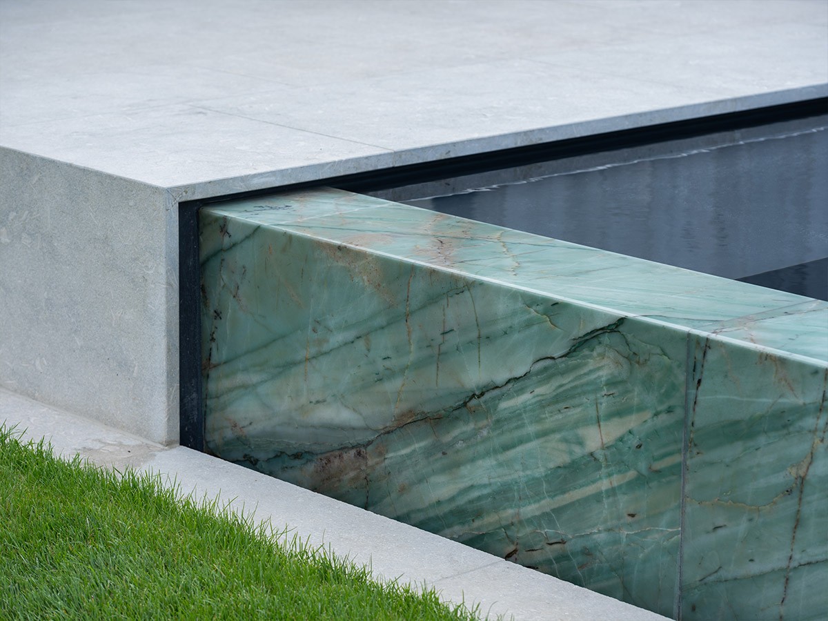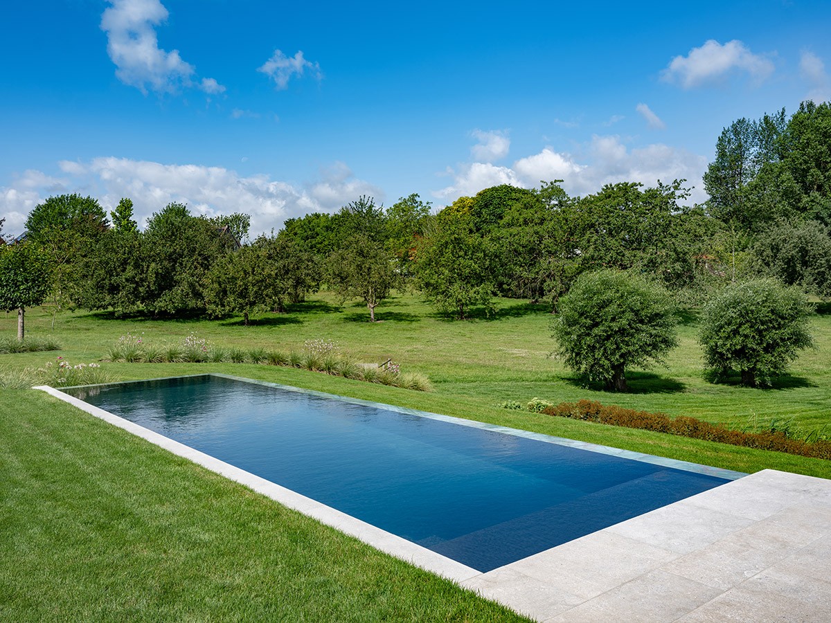 Aan de rand van een weids landschap realiseerde Art Pools een infinitybiozwembad dat zich opent naar de omgeving en het gevoel van rust versterkt. De groene natuursteen van de boord- en overlooprand zorgt voor een subtiele verbinding tussen water, gras en poolhouse. Dankzij de hydrolysetechniek blijft het water helder zonder chemicaliën. Het strakke lijnenspel en de zachte groentinten brengen architectuur en natuur in perfecte balans. In de tuin heerst er een sfeer van sereniteit en verfijning.