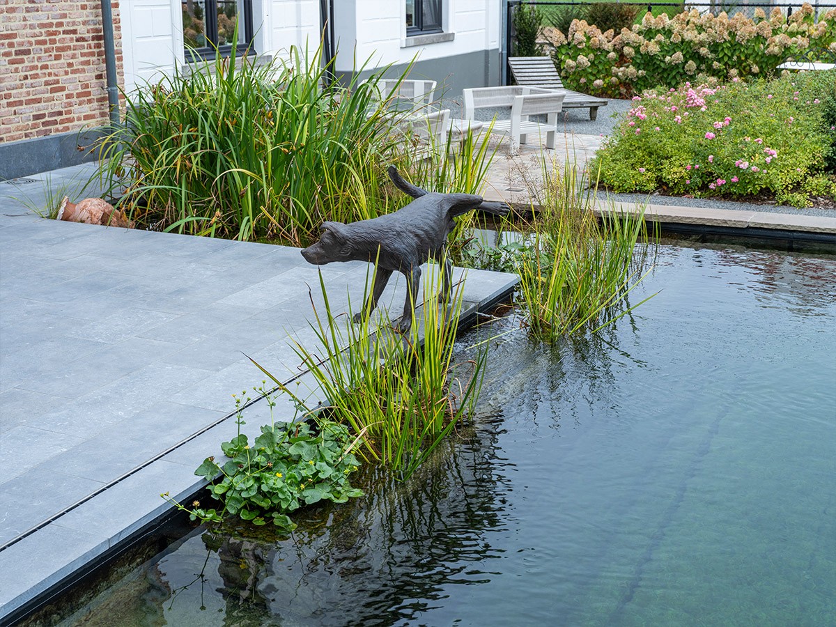 In het glooiende landschap van Leefdaal realiseerde Tuinwerken Willemsens een elegante zwemvijver die perfect aansluit bij de landelijke architectuur van de woning. De strakke vormgeving contrasteert subtiel met de natuurlijke omgeving, terwijl de combinatie van Kandla-natuursteen en Ierse blauwe hardsteen zorgt voor een warme, tijdloze uitstraling. De beplanting en het zorgvuldig ontworpen moerasgedeelte brengen een harmonisch evenwicht tussen natuur en design. Kortom, een tuinproject dat rust en verfijning uitstraalt.