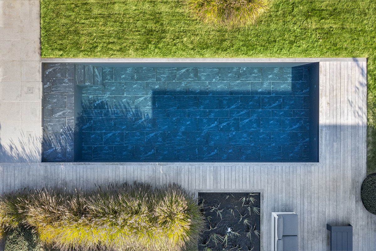 Dit stijlvolle project, gerealiseerd door Hybrid Pools, combineert de natuurlijke uitstraling van een zwemvijver met het comfort van een modern zwembad. Dankzij een innovatief hydrolysesysteem blijft het water langdurig kristalhelder, zonder dat er chemische producten nodig zijn. De strakke lijnen, het antracietkleurige wateroppervlak en de verfijnde beplanting met kalmoes, beekpunge en iris versterken samen de rustgevende sfeer. Een perfect samenspel van techniek, esthetiek en natuur, waarin luxe en eenvoud hand in hand gaan.