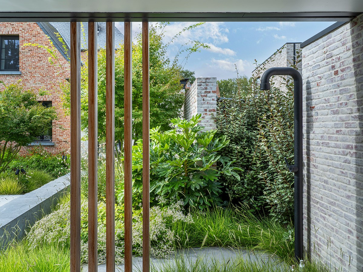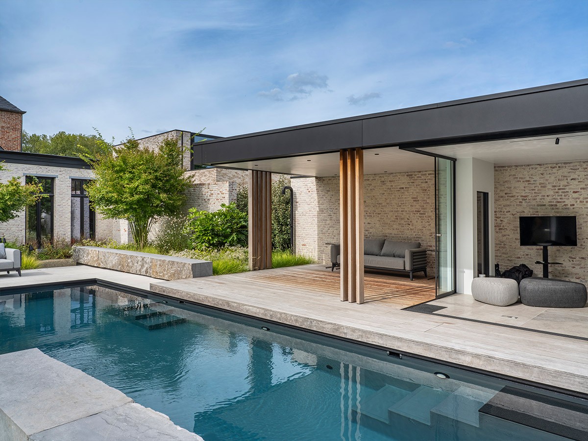 Met dit project realiseerde Puur een strak poolhouse dat de brug slaat tussen een landelijke woning en moderne tuinarchitectuur. De gerecupereerde en gechipperde bakstenen muren en hardhouten steunpalen verbinden het ontwerp visueel met de woning, terwijl panoramische glaspartijen in staal zorgen voor maximale openheid en een natuurlijke overgang naar de tuin en zwemvijver. Binnen creëert de Finse sauna aan de achterzijde een warme, intieme wellnessbeleving met een prachtig uitzicht op het omliggende landschap, waar rust, licht en comfort samen een unieke sfeer oproepen.
