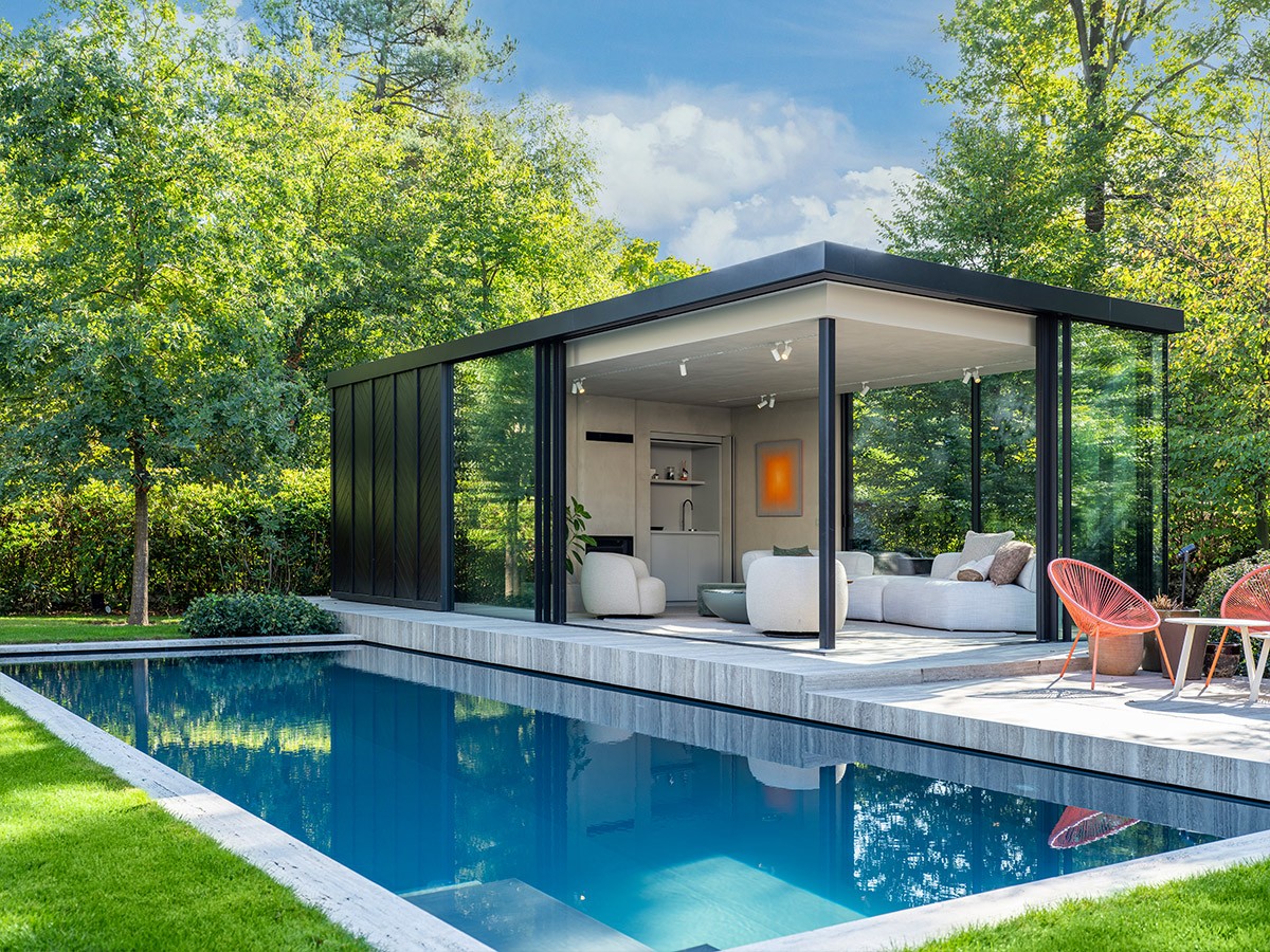 In Keerbergen bouwde BoGarden een modern poolhouse dat perfect aansluit bij de landelijke woning. Het ontwerp straalt rust en eenvoud uit dankzij de combinatie van zachte aardetinten, een natuurlijke Mortexafwerking en een vloeiende overgang tussen binnen en buiten. De gevel in donkerbruin visgraatmotief geeft karakter en diepte, terwijl de grote glazen schuiframen rondom voor een open, lichtrijke beleving zorgen. Binnen zorgen een gashaard en verfijnde interieurelementen voor een warme, huiselijke sfeer. Een stijlvol project waarin architecturale finesse en comfort samenkomen aan het water.