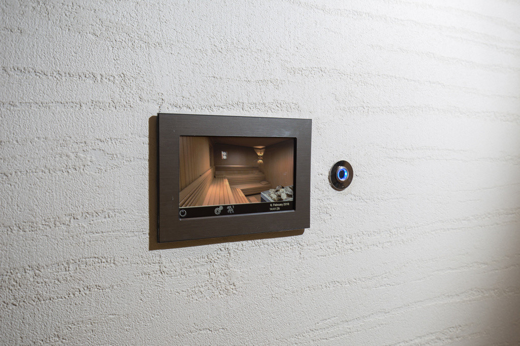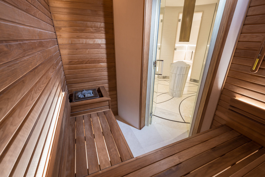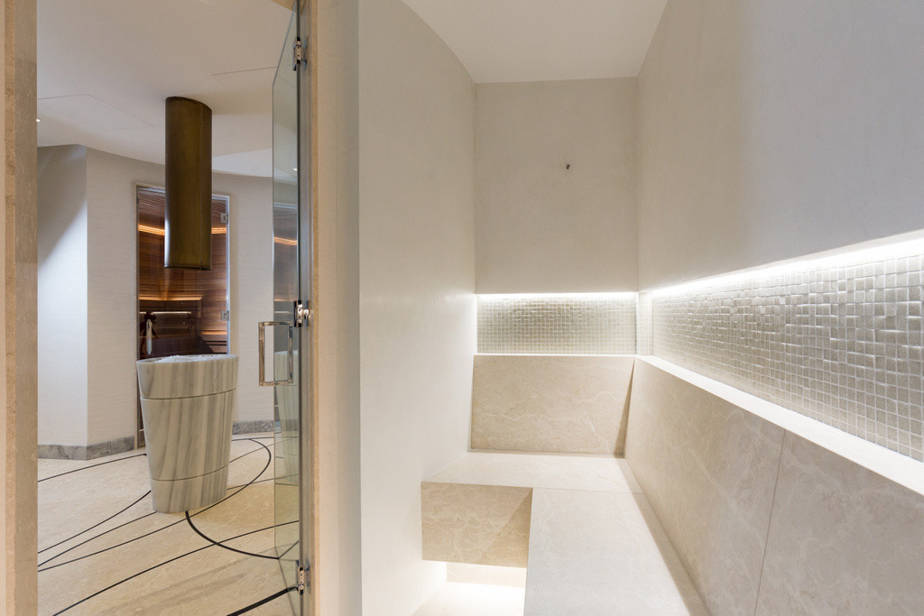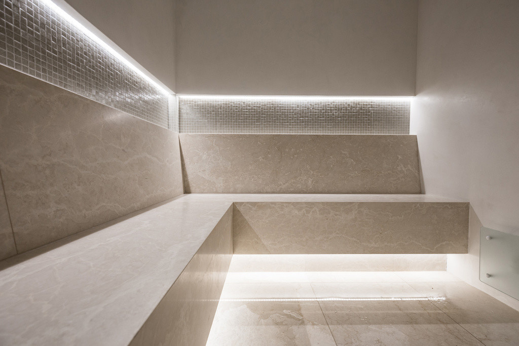 In het centrale punt van deze ruimte staat een luchtgekoelde ijsmachine die 24 uur op 24 ijs genereert, tot wel 150 kg per dag. Hier rond werden de sauna, hamam en douches geïnstalleerd. Achter de deuren in mat glas bevinden zich een toilet en de technische ruimte. Deze cirkelvormige opbouw geeft zowel een gevoel van knusheid en gezelligheid als een gevoel van eindeloosheid. Ideaal om de tijd even te vergeten en zich zich over te geven aan de ontspanning die je hier kan ervaren. Met een touchscreen, subtiel weggewerkt in de muur, zijn zowel de sauna als de hamam eenvoudig te bedienen. De sauna werd gemaakt van thermo aspenhout. Een exclusieve houtsoort die heden ten dage vaak vervangen word door thermo ayoushout, omdat deze in meer maatuitvoeringen beschikbaar is. De banken werden op twee niveaus geïnstalleerd, zodat je kan kiezen welke warmte je op dat moment liefst geniet. De oven is onopvallend ingebouwd in de hoek van de bank. De halfronde voorwand, afgewerkt met stukwerk, gaat naadloos mee met de ronde vorm van de centrale hal. In de ruime hamam is het hemels vertoeven dankzij de indirecte ledverlichting die werd geplaatst in een 6 cm-diepe niche boven de L-vormige zitbank. Samen met de mozaïek- en marmerafwerking geeft dit het geheel een feeëriek effect. Hier kan de eigenaar vele ontspannende momenten in hogere sferen te vertoeven …