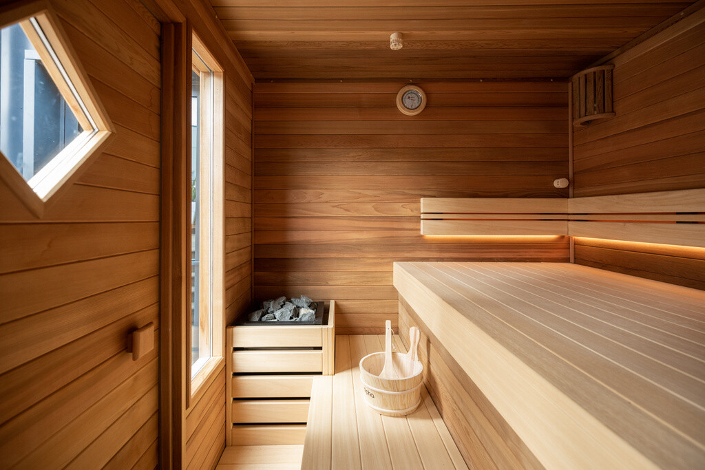 Le sauna est attaché à une façade d'un côté, avec le toit fini dans le même matériau. Les murs sont en bois de cèdre, qui forme également la finition intérieure. Le banc en ayous à deux niveaux, avec une banquette supérieure très large, offre un confort spacieux. En position assise ou couchée, vous pouvez regarder à travers les fenêtres hautes qui bordent la porte. Le sauna est accessible par un escalier qui vous donne l'intimité nécessaire. Un voyage dans ville avec la tête dans les nuages!