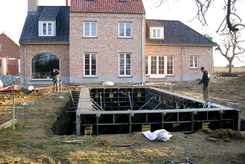 Dit zwembad meet 4 x 9 m en is 1,5 m diep. Na het graven van de kuil werd de grondplaat van 25 cm gestort. Vervolgens werden de betonnen, waterdichte muren gegoten die eveneens 25 cm dik zijn. De kuip kreeg een isolatielaag van 3 cm en werd bekleed met een lichtgrijze liner.
