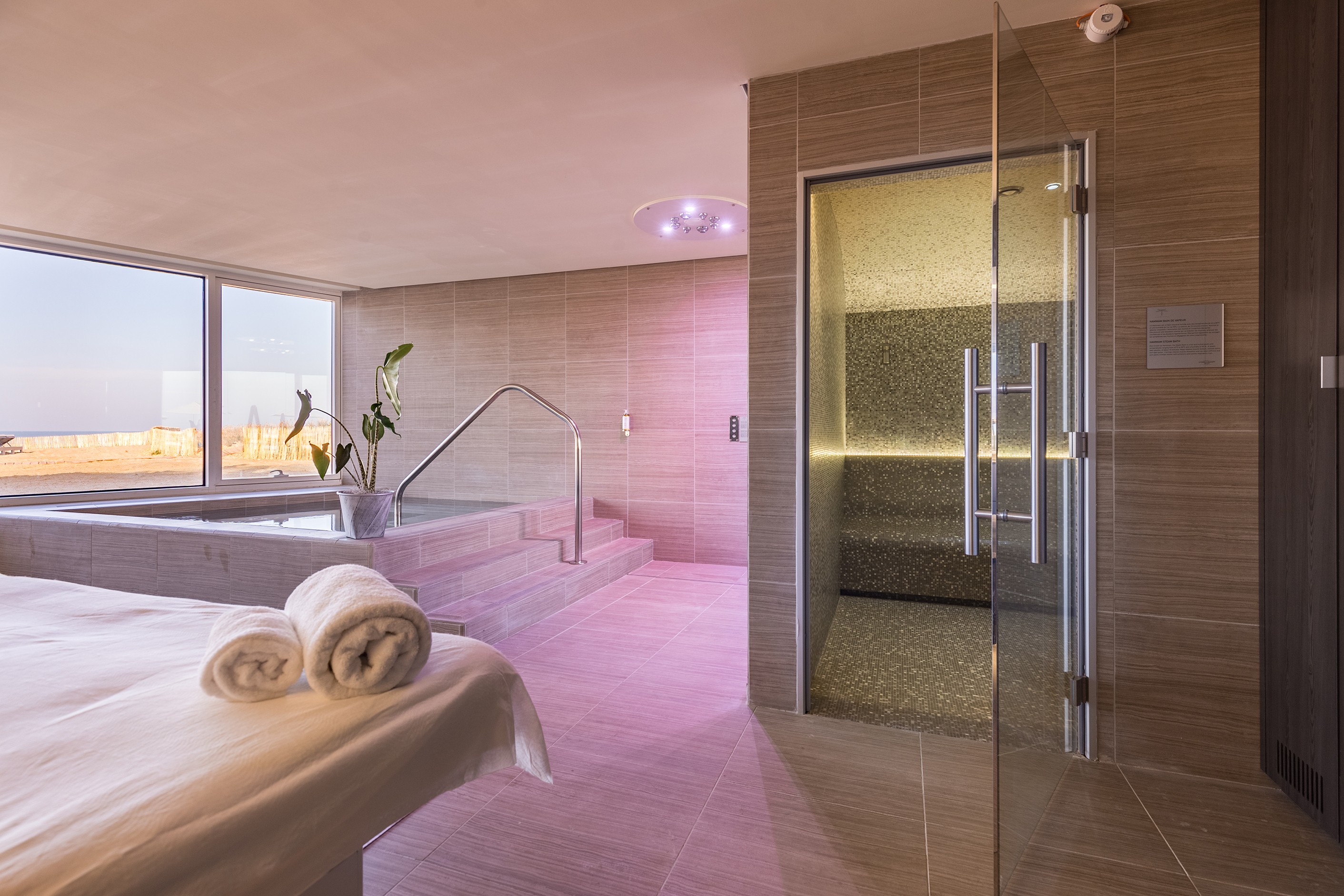 Het hotel stelt alles in teken van de oceaan. De gastronomische keuken, de Thalasso Spa Marin en de Spa Nuxe. Voor deze laatste mocht AWS een Chaleur Pro sauna en hamam installeren. Beide afgewerkt met sfeervolle ledverlichting, luidsprekerset en de Alpha luxedeur, zorgen ze voor een stijlvolle relax-ervaring. De saunakuur kan je afwisselen met allerhande schoonheidsverzorgingen en massages. De oceaan was nog nooit zo rustgevend!