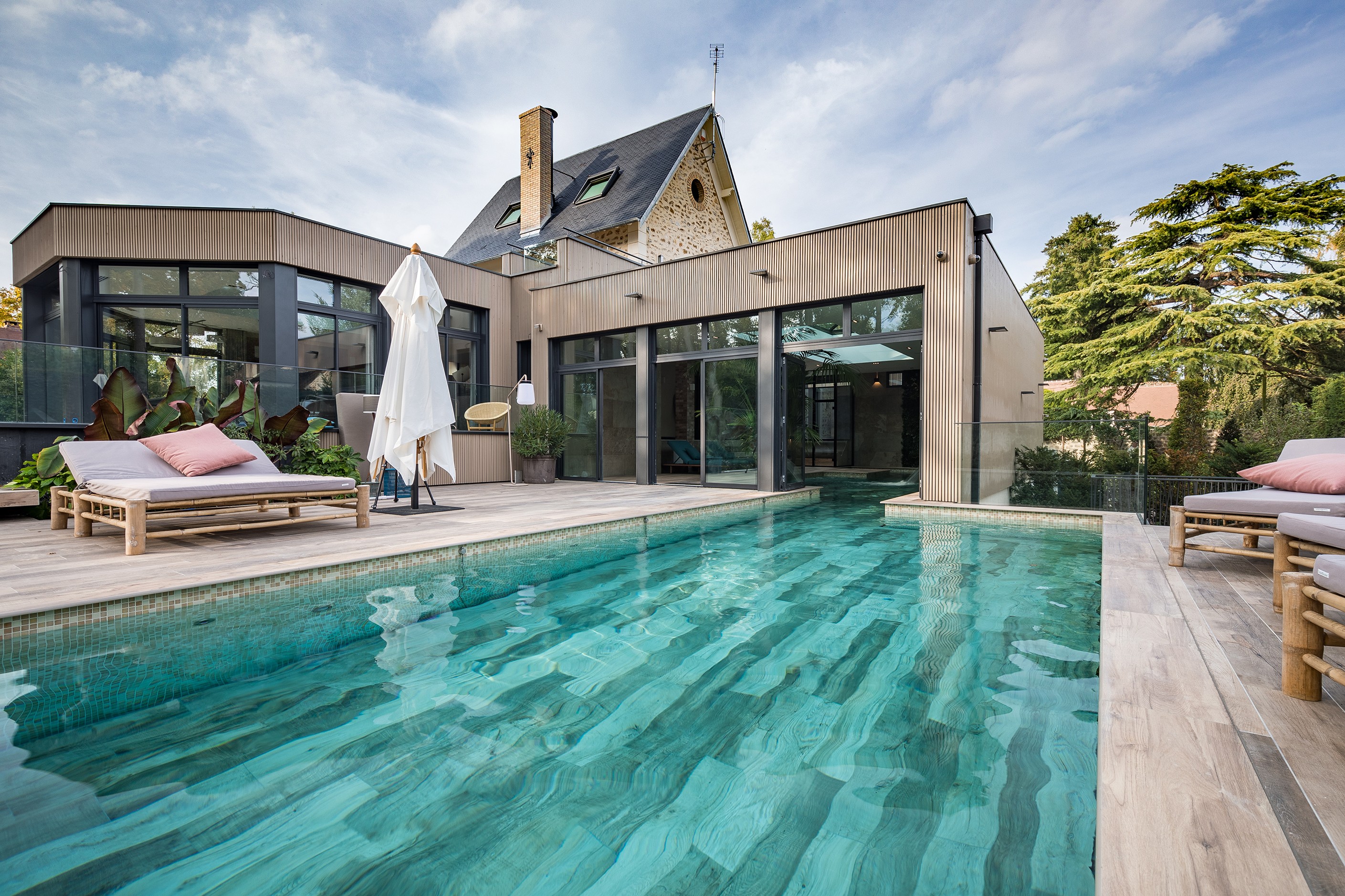 Aan deze woning werd een volledige bijbouw geplaatst in het teken van ontspanning. Een prachtig zwembad met spa-functie loopt door van binnen naar buiten. Hierrond werd een sauna en hamam mooi geïntegreerd door Alpha Wellness Sensations. Het geheel is modern opgevat met mooi gebruik van materialen en verschillende hoekjes om gezellig te loungen. De toegang tot de sauna en de hamam is gemaakt in een glazen wand die is afgewerkt met een zwart aluminium kader, geheel in lijn met de ramen, deuren en dakkoepel in de ruimte. Maar ook in de achterzijde is telkens een raam voorzien zodat je zowel vanuit de sauna als de hamam ook van de tuin kan genieten.
