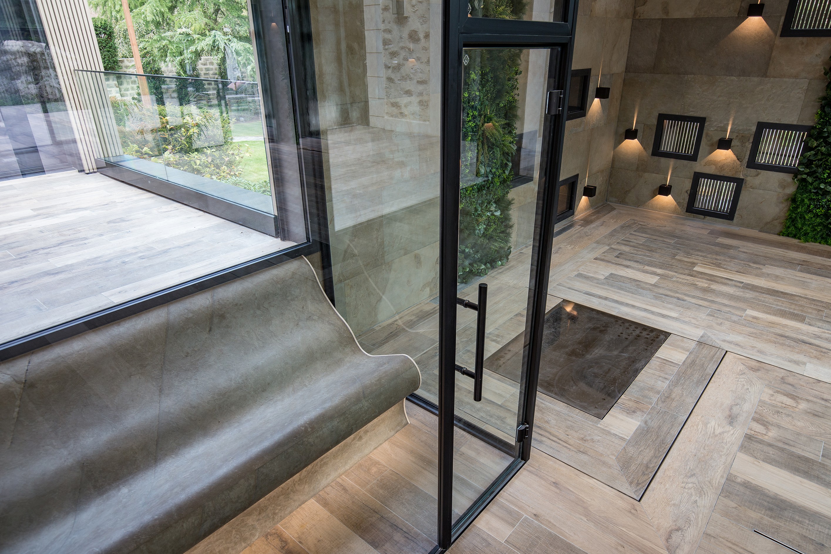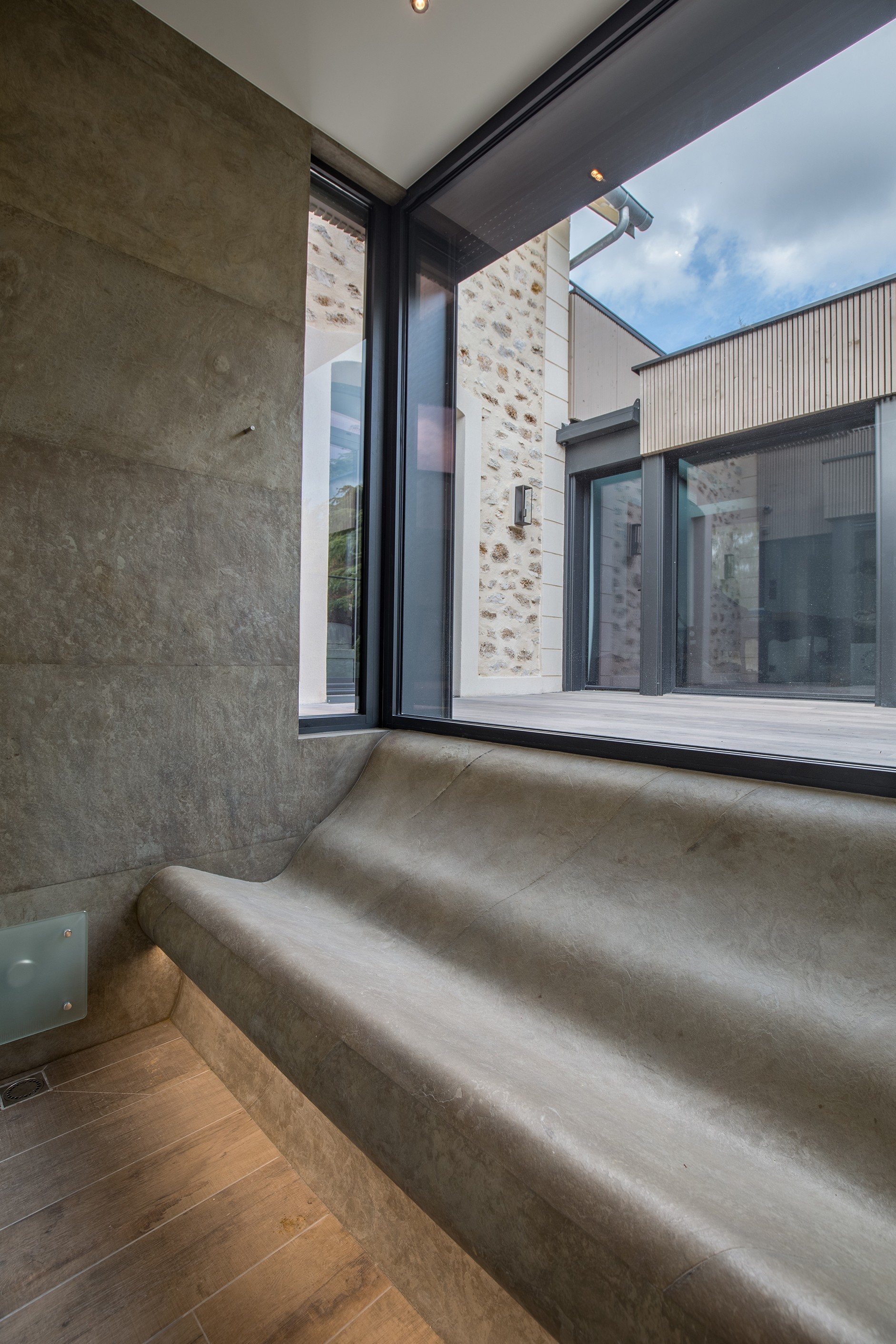 De afwerking binnenin de sauna is in licht hout en fineer, met smalle planken voor de bank en de vloer en bredere planken voor de zijwanden, de achterwand en het plafond. Een leuke moderne touch! In het plafond zijn de verlichtingsspots ingebouwd. De vloer rond het zwembad werd doorgetrokken in de hamam. De glooiende ligbank nodigt uit tot relaxen en is afgewerkt in gemarmerde epoxy, die aansluit bij de afwerking van de wanden. Van onder de bank krijg je warm indirect licht tezamen met de spots die ook hier in het plafond verwerkt zijn. Kortom, een rijkelijk project dat gezien mag worden!
