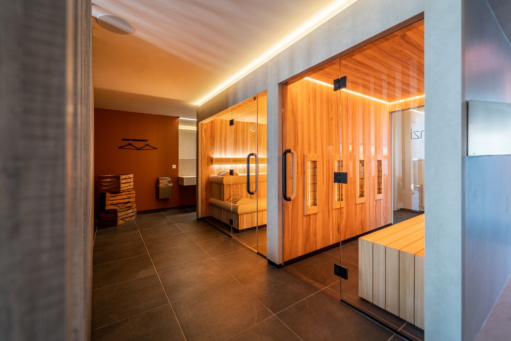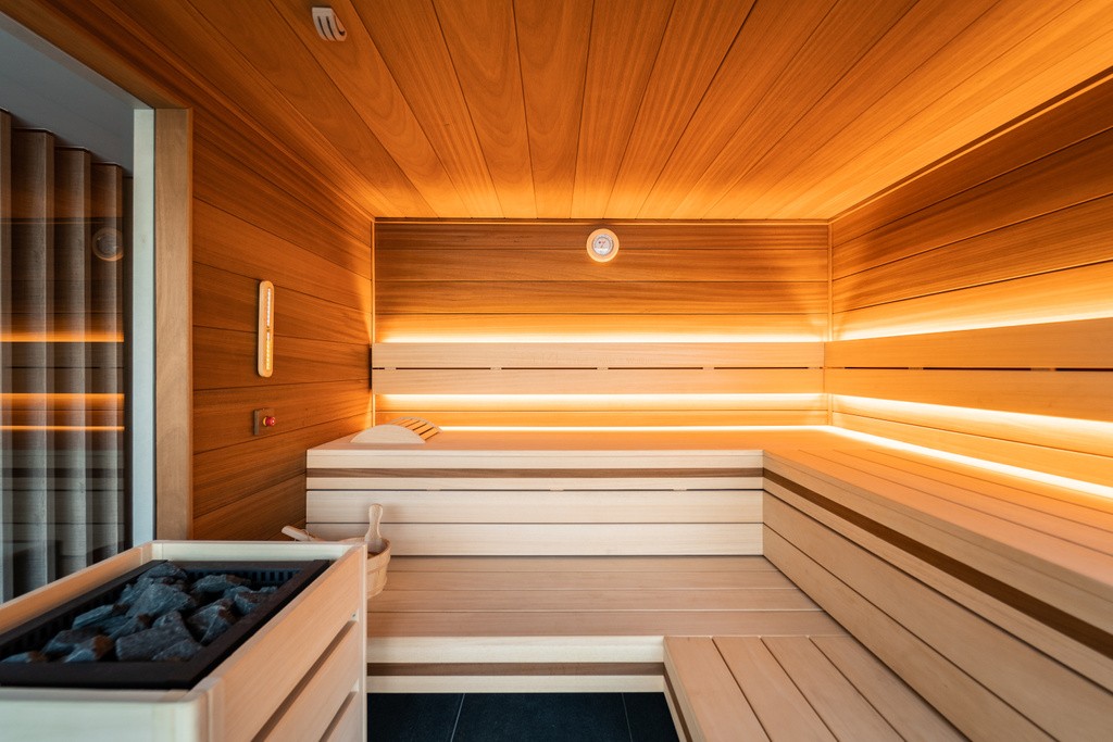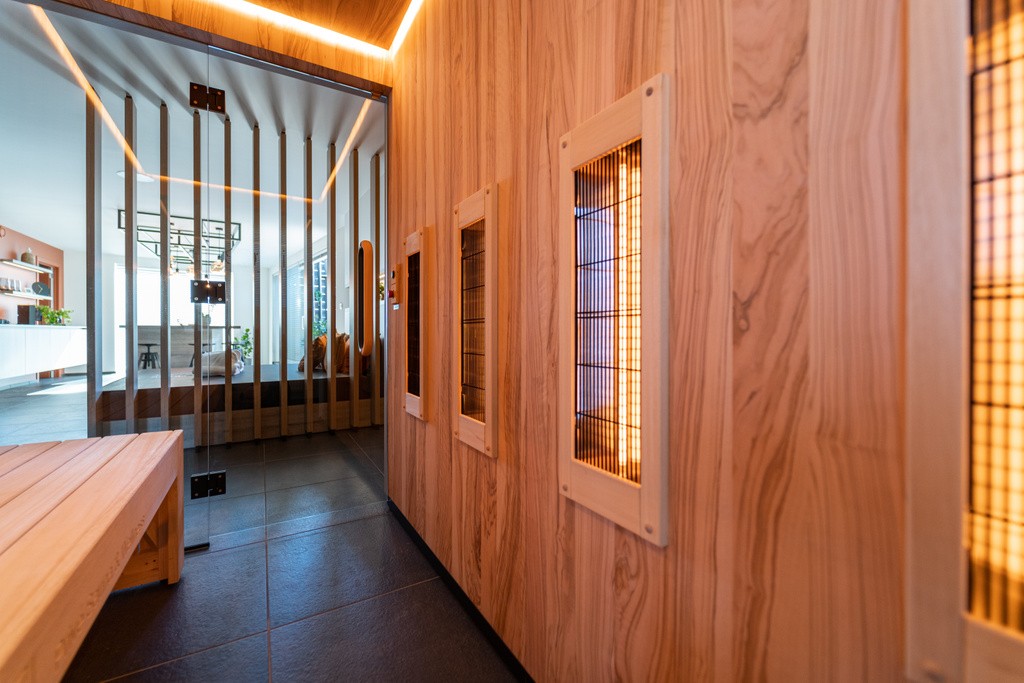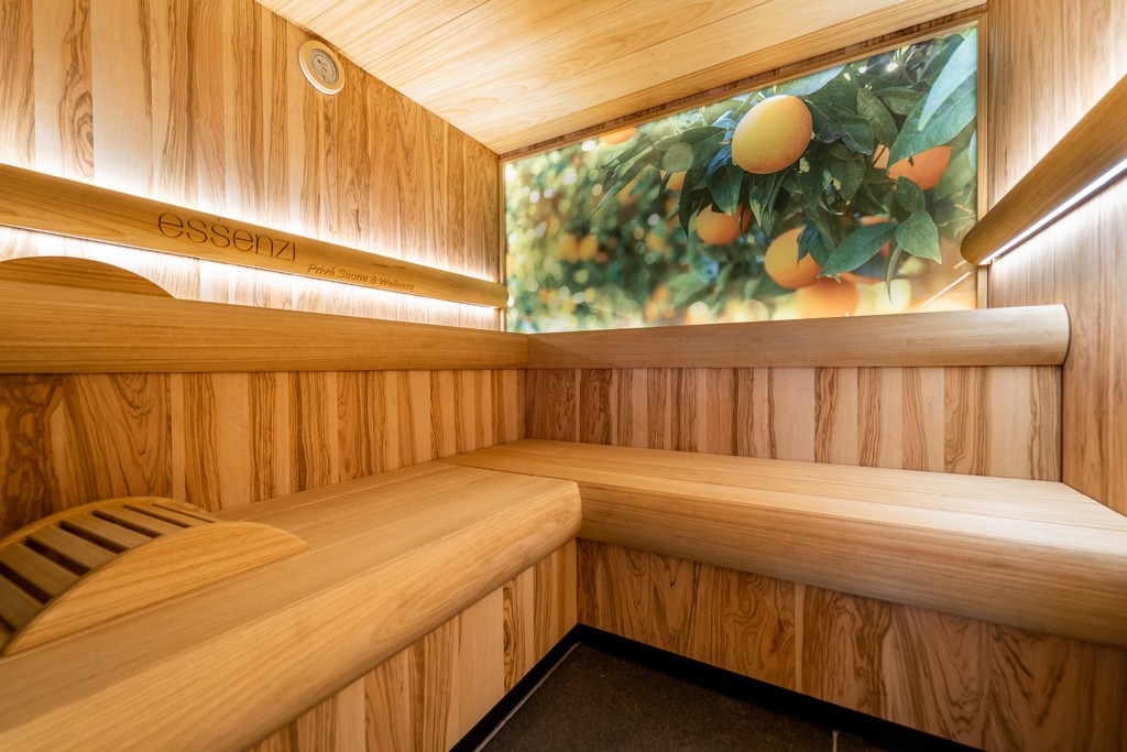 Paradepaardje is hier de bio-stoom-sauna. De warmte wordt gegenereerd door onzichtbare infraroodverwarming in de wanden en de banken. Hierdoor voel je de warmte echt stralen op je lichaam. Daarnaast zorgt een stoomgenerator voor een hoge luchtvochtigheid met een lichte toets van sinaasappel. Samen met de geur nemen de ook beelden op de achterwand en aan de stoomuitlaat je mee naar zuiderse sferen. Deze prints werden gedrukt op veiligheidsglas. Verder heeft deze gezellige sauna een binnenbekleding van fineerplaten met warme houtstructuur en brede gesloten banken uit ayoushout die extra behandeld werden met een kleurloze olie. Een topper, uniek in Europa.