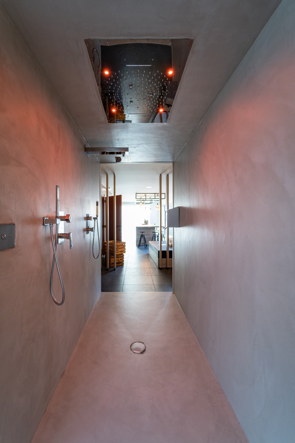 De unit bestaat verder uit een klassieke Finse sauna, een infraroodruimte, een luxueuze douche en een spa op het terras. Dit terras bevindt zich op het dak, zodat je een echte rooftop-ervaring beleeft in het bubbelbad. Dit is aangesloten op de buffertank en geeft plaats aan zes personen. Massagejets en een luchtpop zorgen voor het nodige gebruis. De ruime sauna is volledig uit ayoushout met extra brede banken op twee niveau's en brede planken voor de binnenbekleding. In de infraroodruimte zien we de fineerplaten type Olive uit de bio-sauna terugkomen voor de afwerking. De stralers staan tegenover elkaar om zowel rug- als voorzijde van het lichaam te verwennen met de deugddoende infraroodwarmte. Het wellnessen wordt telkens afgesloten met een heerlijke waterbeleving onder de Ama Luxury Urano, en met de handdouche Ninfe. Het enige wat je in deze ruimte tekort kan komen, is tijd om er lang genoeg van te genieten!