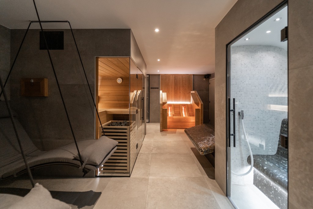 De sauna, het stoombad en de infrarood zijn van het type Chaleur Pro met ayoushout in de hoofdrol. In de sauna prijkt een 3D-wand. Deze wordt door de dubbele indirecte verlichting achter de rugleuning mooi in de verf gezet. Zowel de voorwand als een stukje van de zijwand zijn uit glas zodat dit speciale effect zeker gezien kan worden. De banken, type Mirage, en de omkasting van de saunaoven zijn opgebouwd uit dunne latjes, terwijl de verdere binnenafwerking uit brede planken bestaat. De dunne latjes maken ook de loungebank van de infrarood. Deze heeft 2 gevormde stralers, aangevuld met vier stralers aan de zij- en voorkant. Hier sieren fineerplaten met eikmotief de binnenzijde en achterwand.