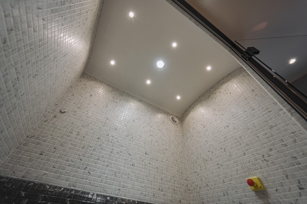 Het stoombad treedt je binnen via de Alpha Luxe deur. Het donkere aluminium kader past goed bij de kleurschakeringen van de mozaïek. Spots in het plafond en indirecte verlichting onderaan de bank zorgen hier voor de sfeer. Samen met de stoom zorgen heerlijke aroma’s voor een ontspannend en gezond effect. Verse lucht komt ook via de stoomuitlaat binnen. Bovendien is er een afkoelslang aanwezig. Als dat nog niet voldoende is, kan je na de warme sessie nog stevig verkoelen met de stortemmer vol ijskoud water. Alles is aanwezig om je lichaam een stevige opkikker te geven!