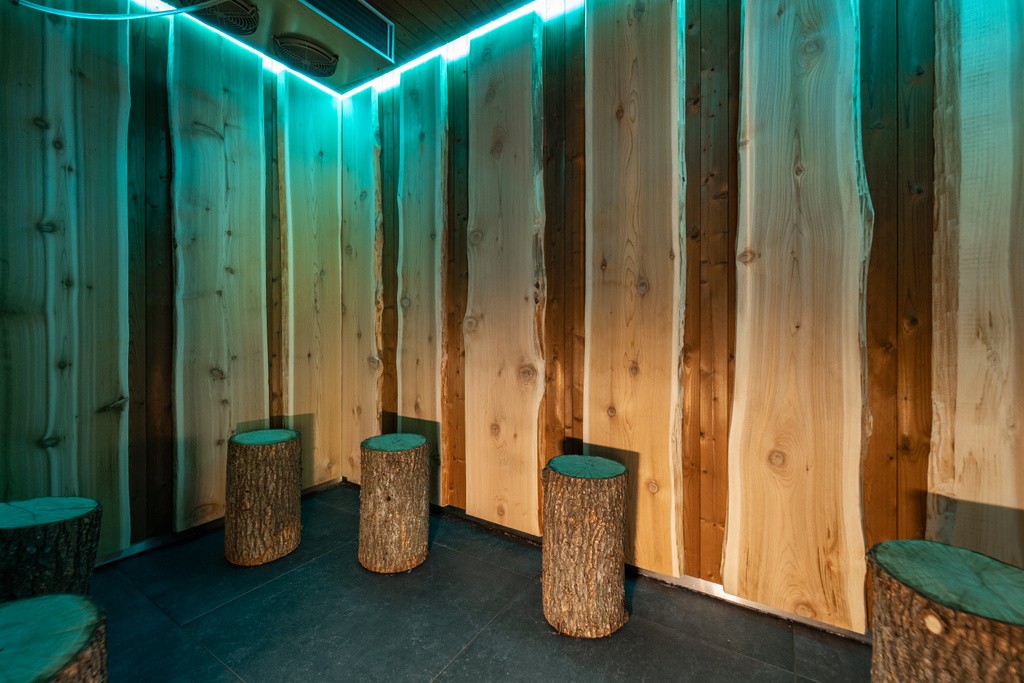 Fijne ayouslatjes vormen de banken en rugleuning van de Bio-sauna. De lichte kleur komt terug in het vurenhout van de wanden en het plafond. Blauwe steenstrips uit kwarts brengen kleur aan de achterwand en vormen een mooie contrast met het hout. In de zoutgrot zijn de voor -en achterwand bezet met ruwe zoutstenen. Dit grove effect geeft een authentieke sfeer aan de sauna die verder met gladde ceder planchetten werd bezet en twee zachtgolvende loungebanken uit smalle ceder latjes heeft. Het zouteffect wordt nog versterkt door de verdamper. Als laatste van de warmtekamers is er het stoombad. Deze strakke hamam verbindt banken met een witbeige mozaïek met wanden uit antracietkleurige XL-tegels. Het lichte plafond maakt het plaatje compleet samen met de spots en de ledverlichting onder de bank.
