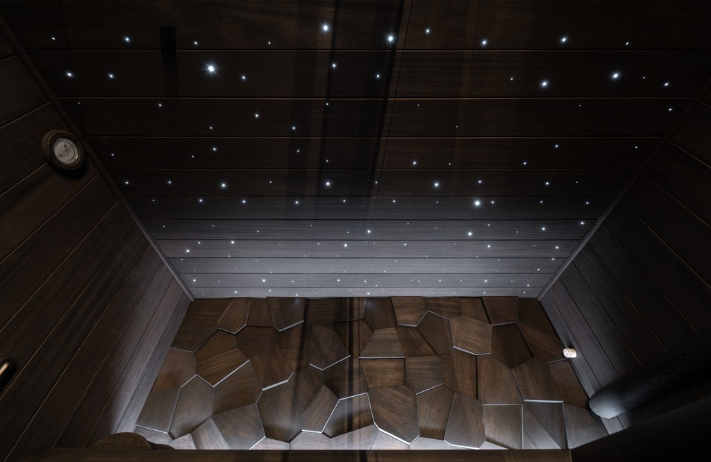 In de tuin spotten we de eerste sauna uit het gamma van Alpha Wellness Sensations. Dit is de XXL-versie van de Eclipse. Perfect geïntegreerd in de natuur door de buitenafwerking met heidematten. Binnenin worden ceder- en ayoushout gecombineerd met een achterwand uit ruwe zoutstenen. De saunaoven heeft hier een automatisch opgietsysteem en in de verwarmde voorruimte werden kapstokken voorzien. Binnen in de gerenoveerde boerderij werden verder 5 thema-sauna’s prachtig geïnstalleerd tussen de verschillende rustruimtes en het zwembad. De Kelo-sauna heeft die typisch warme inkleding met ruwe kelo-houtpanelen. Traditionele lampen in de hoeken geven hierbij extra sfeer. De Lumino-sauna heeft een feeëriek lichtspel van ledverlichting. Zo heeft de sterrenhemel bijna 350 lichtpuntjes en is de achterwand met kubische vormen indirect uitgelicht, net zoals de afgeronde hoeken van de zitbanken. De donkere behandeling van het hout komt hierdoor extra tot zijn recht.