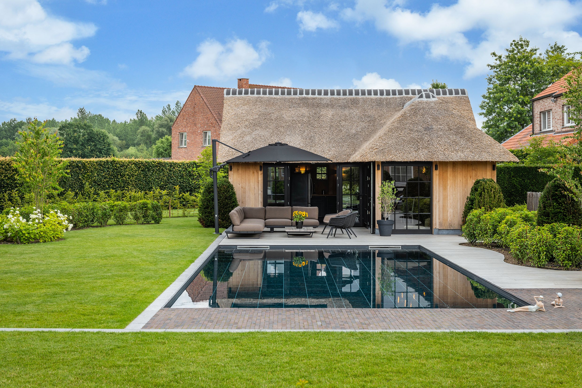 Een biozwembad is een bijzonder type zwembad dat volledig zonder chemicaliën zoals chloor functioneert en perfect aansluit bij de natuurlijke omgeving. Ook dit prachtige project werkt met biologische filtratie om het water schoon en helder te houden, waarbij natuurlijke processen zoals de afbraak van organisch materiaal door micro-organismen centraal staan. Het zwembad is opgebouwd uit duurzame materialen zoals beton, natuursteen en rvs, en straalt een rustige, natuurlijke sfeer uit. Zo genieten de eigenaars van een ecologisch verantwoorde zwemervaring.