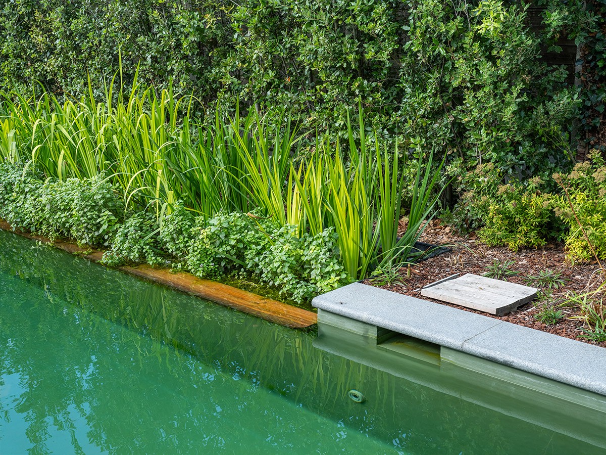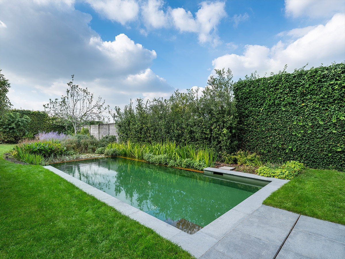 Deze zwemvijver is een prachtig voorbeeld van ecologisch en technisch evenwicht. Met een Biotop-systeem dat zorgt voor natuurlijke filtratie en helder water zonder chemicaliën, combineert het project innovatie met esthetiek. De hellende bodem, de regeneratiezone met klei en waterplanten, en de boord die deels uit cortenstaalprofielen en deels uit natuurstenen tegels bestaat, zorgen samen voor een geheel dat naadloos opgaat in de tuin. Een hedendaags ontwerp dat rust, natuur en technologie verenigt.